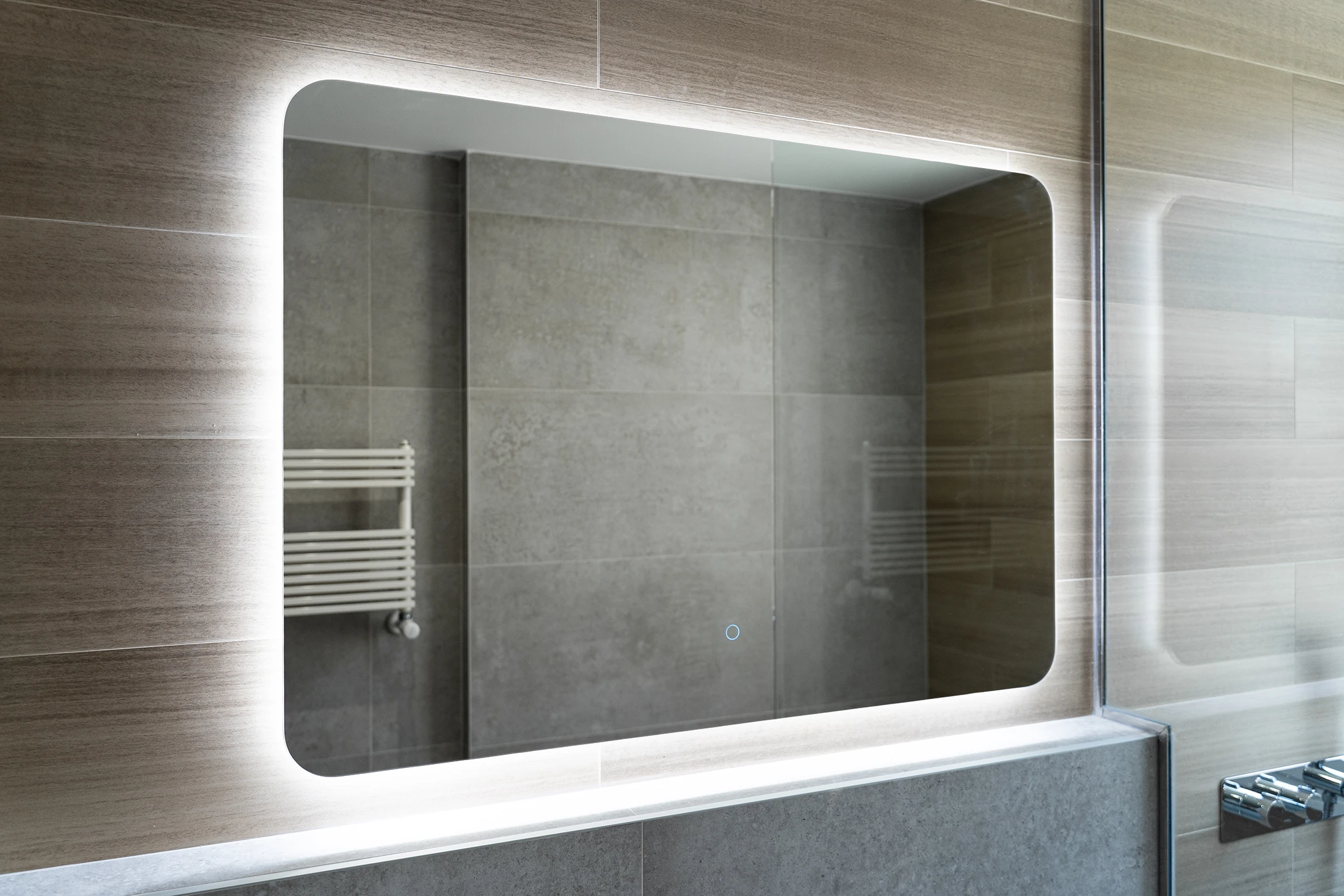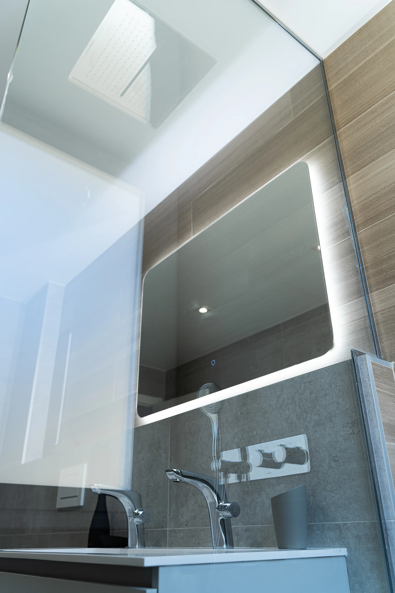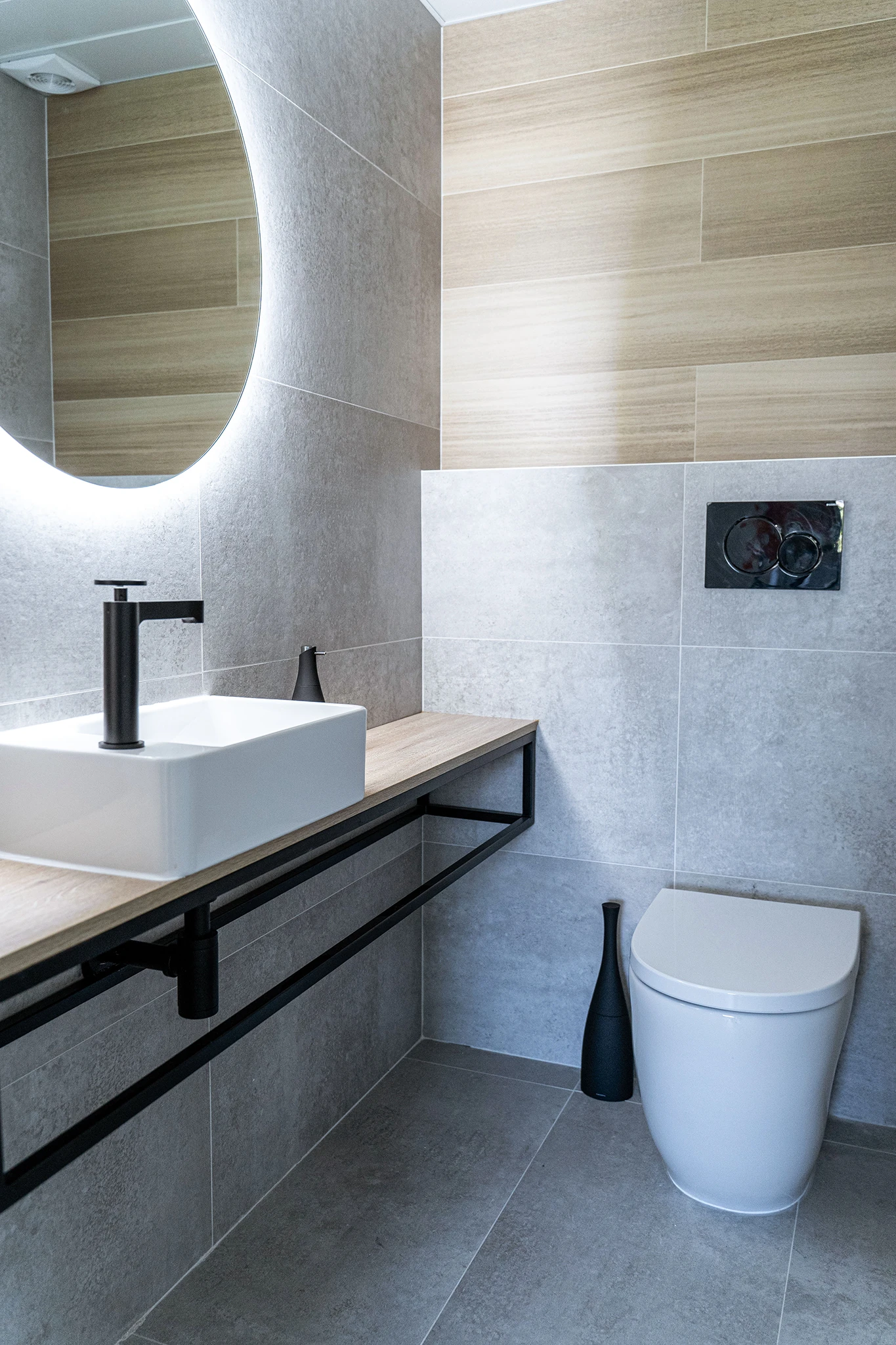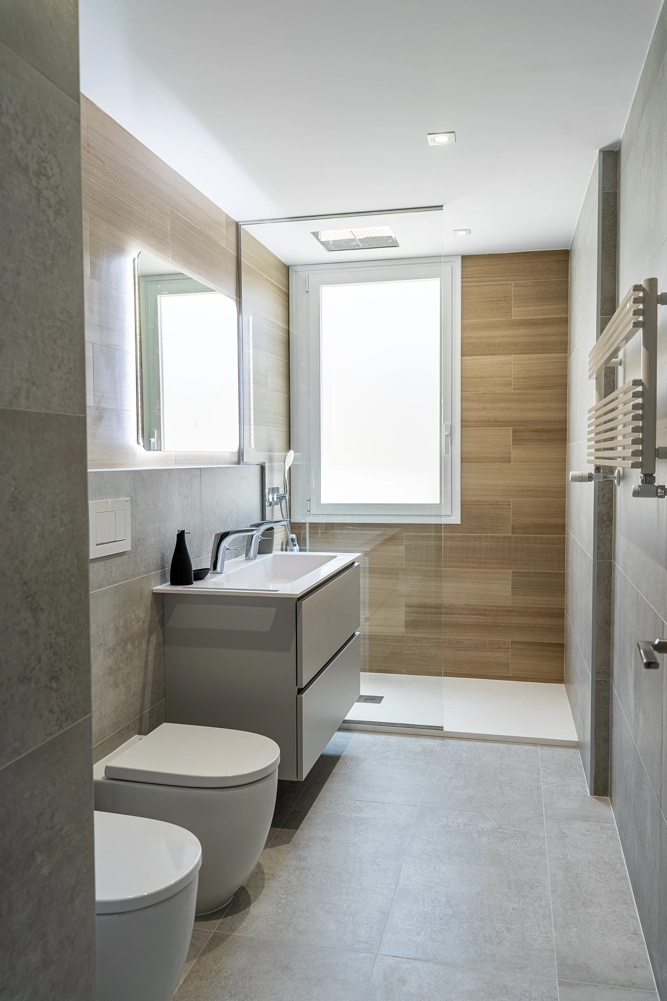 Se redistribuyó por completo el núcleo de aseos dejando un pequeño aseo de cortesía interior y ampliando el baño principal hasta la fachada para dotarlo de iluminación y ventilación desde el exterior. En los baños se da continuidad al pavimento de la vivienda y se aplican toques de calidez y color con un alicatado imitación madera que juega con el resto de tonos madera de la casa.