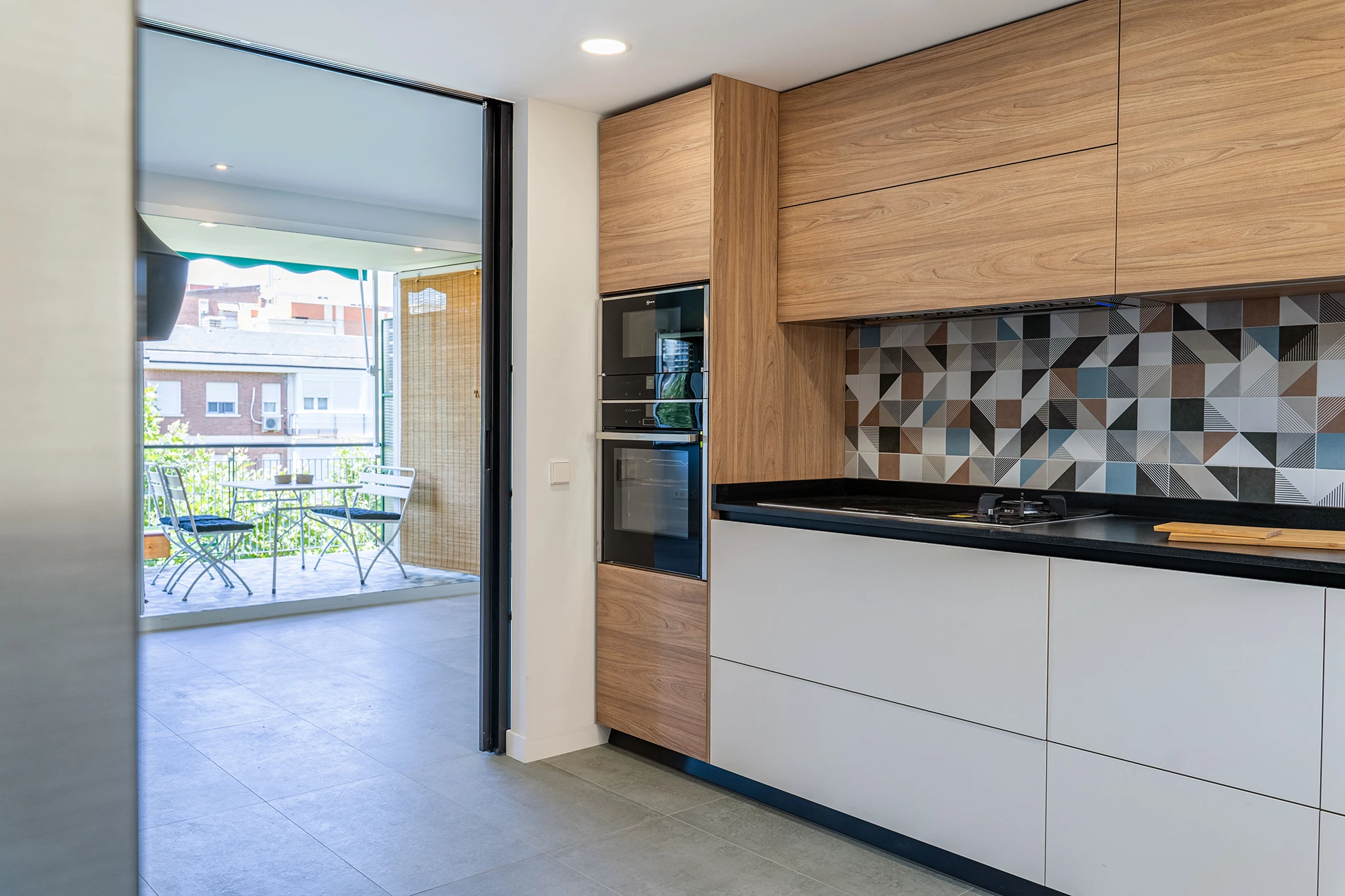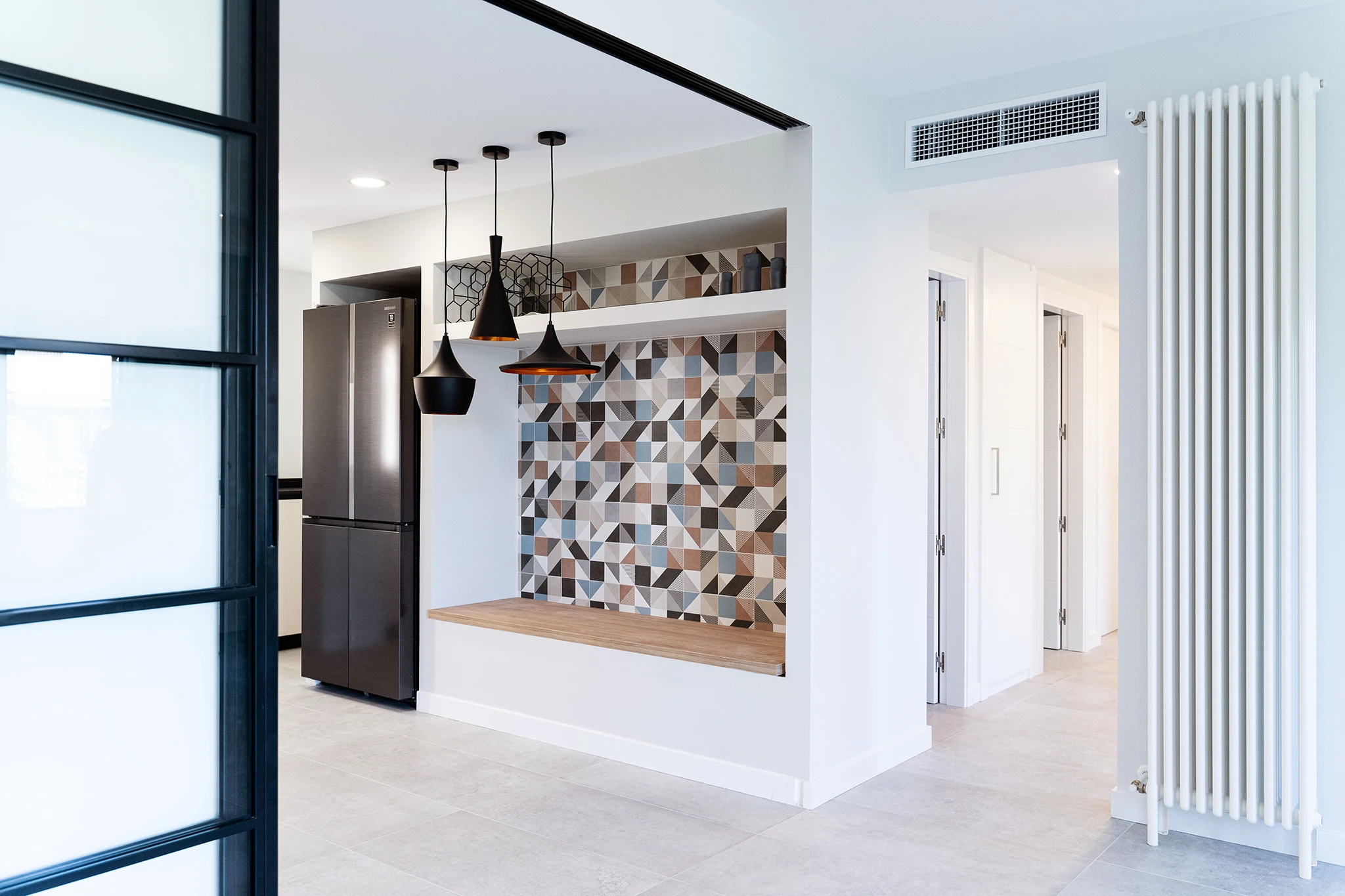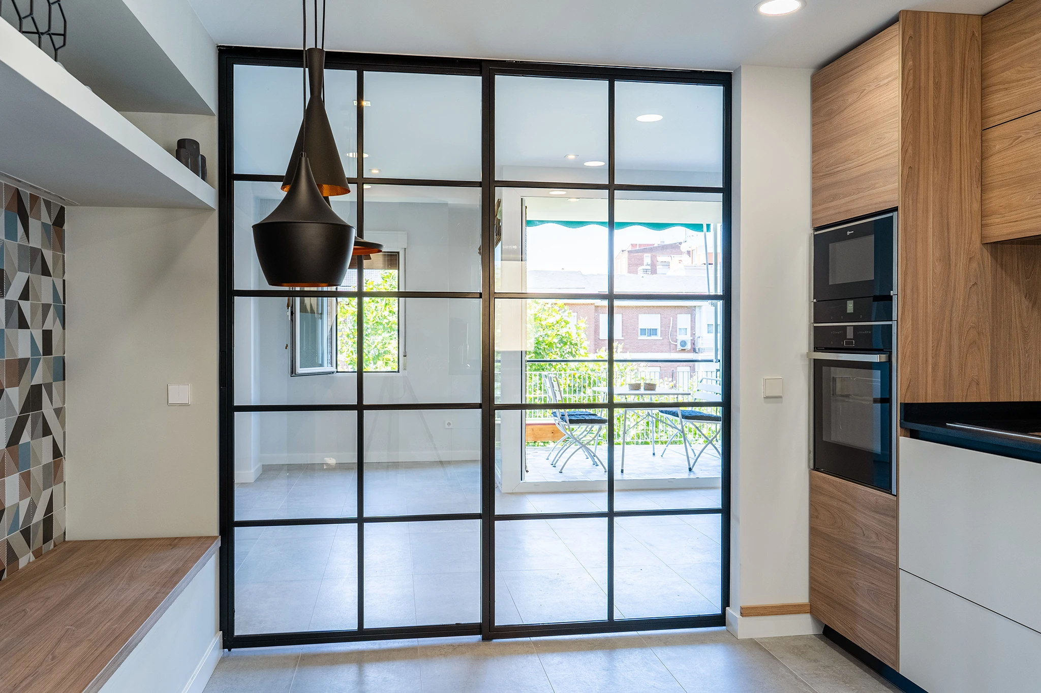 Para dar mas amplitud a la vivienda, en primer lugar, añadimos uno de los dormitorios al salón y elegimos una carpintería abatible en la terraza para poder introducir un poco del exterior en el interior. La cocina se amplía eliminando los pasillos de circulación, tomando parte de otro dormitorio e incorporando el tendedero, además abre al salón con una gran puerta corredera de palillería metálica. De esta forma se comunican fácilmente los espacios de cocina, salón y terraza; este núcleo era muy importante para los propietarios por su carácter sociable y las reuniones con familiares y amigos. Para integrar visualmente estos espacios se escogió un aplacado cerámico muy colorido y con formas geométricas utilizado en el solado de la terraza y en los aplacados de contraste en la cocina.