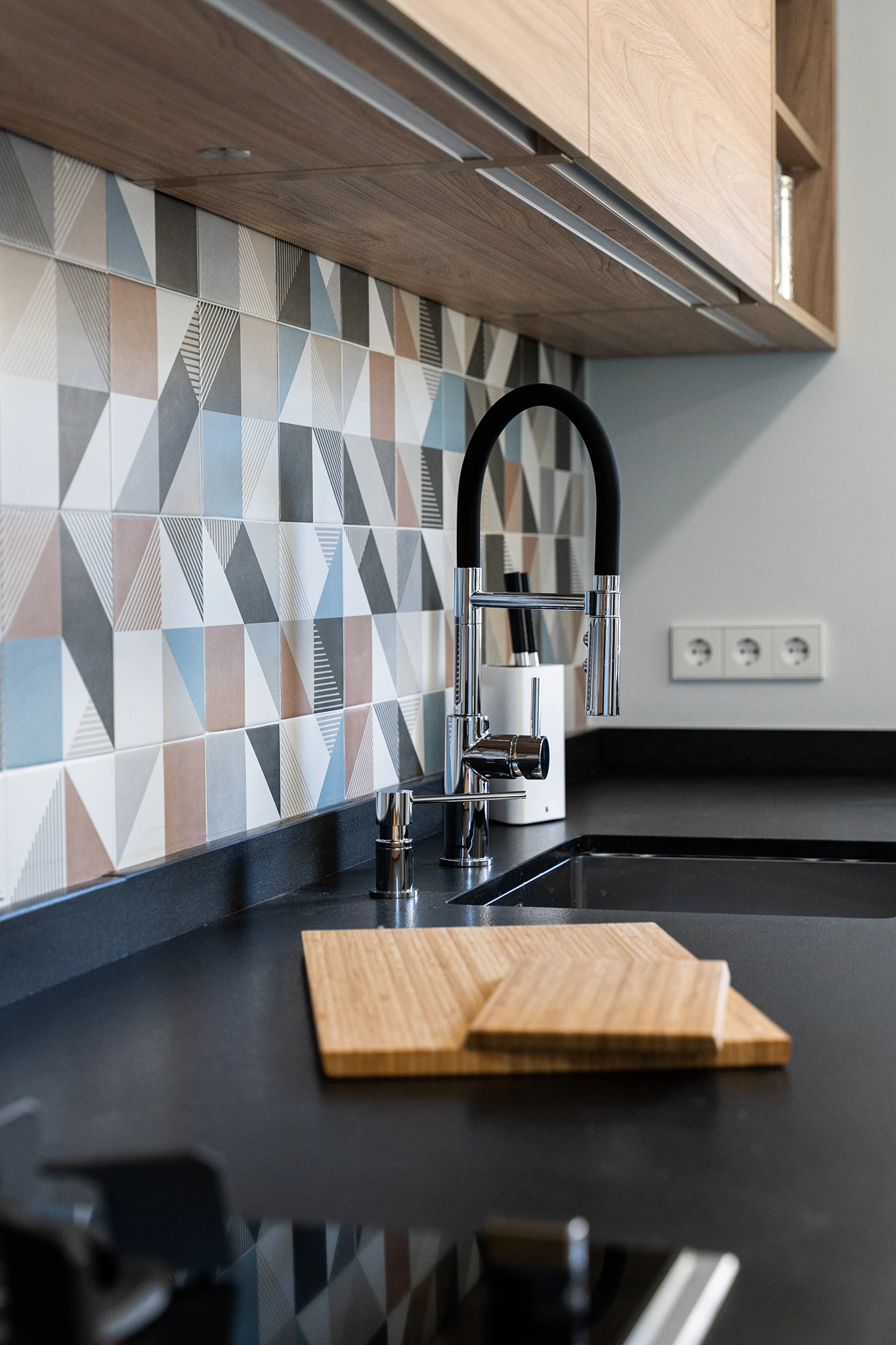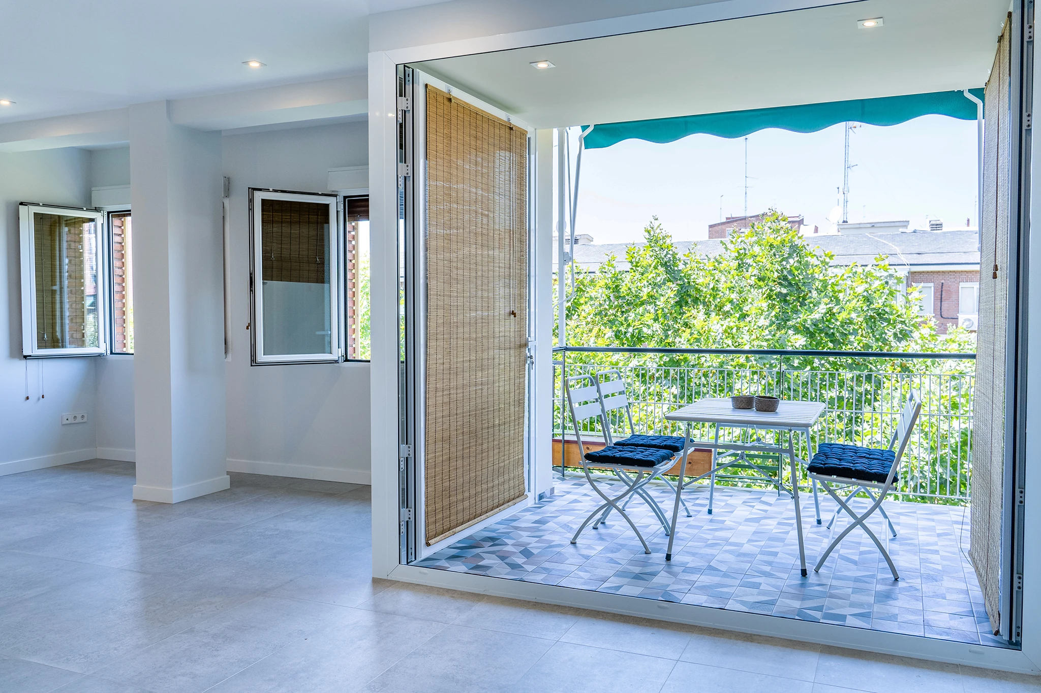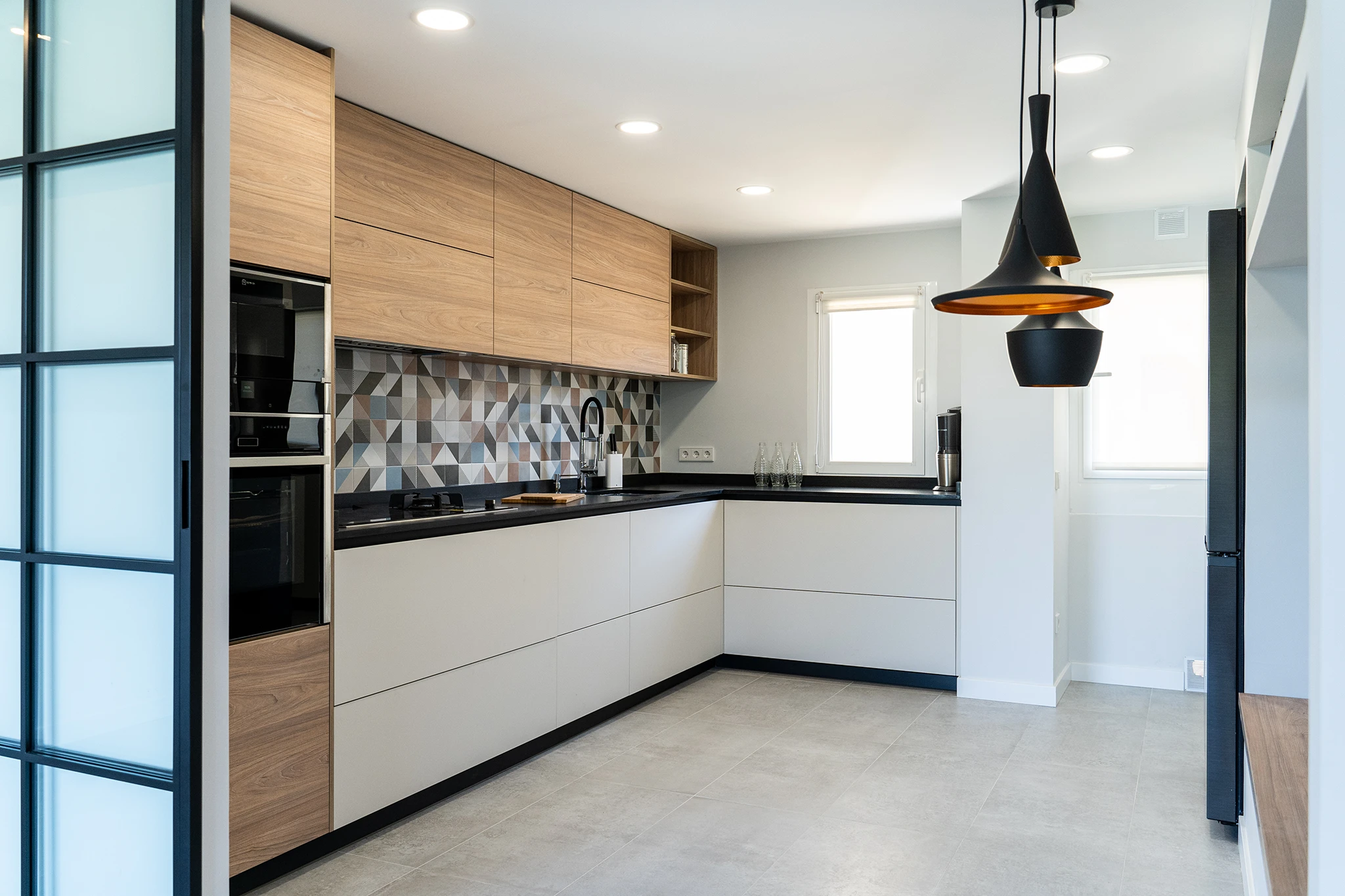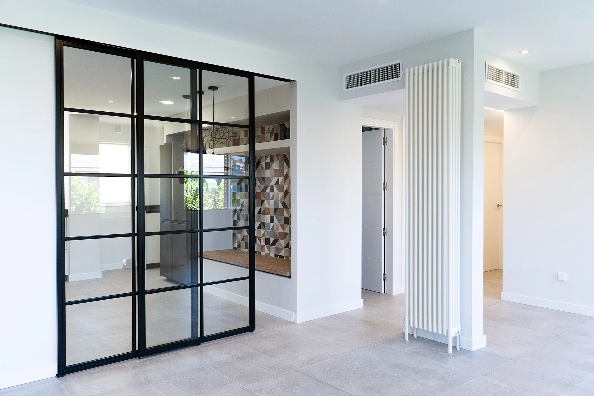 Para dar mas amplitud a la vivienda, en primer lugar, añadimos uno de los dormitorios al salón y elegimos una carpintería abatible en la terraza para poder introducir un poco del exterior en el interior. La cocina se amplía eliminando los pasillos de circulación, tomando parte de otro dormitorio e incorporando el tendedero, además abre al salón con una gran puerta corredera de palillería metálica. De esta forma se comunican fácilmente los espacios de cocina, salón y terraza; este núcleo era muy importante para los propietarios por su carácter sociable y las reuniones con familiares y amigos. Para integrar visualmente estos espacios se escogió un aplacado cerámico muy colorido y con formas geométricas utilizado en el solado de la terraza y en los aplacados de contraste en la cocina.