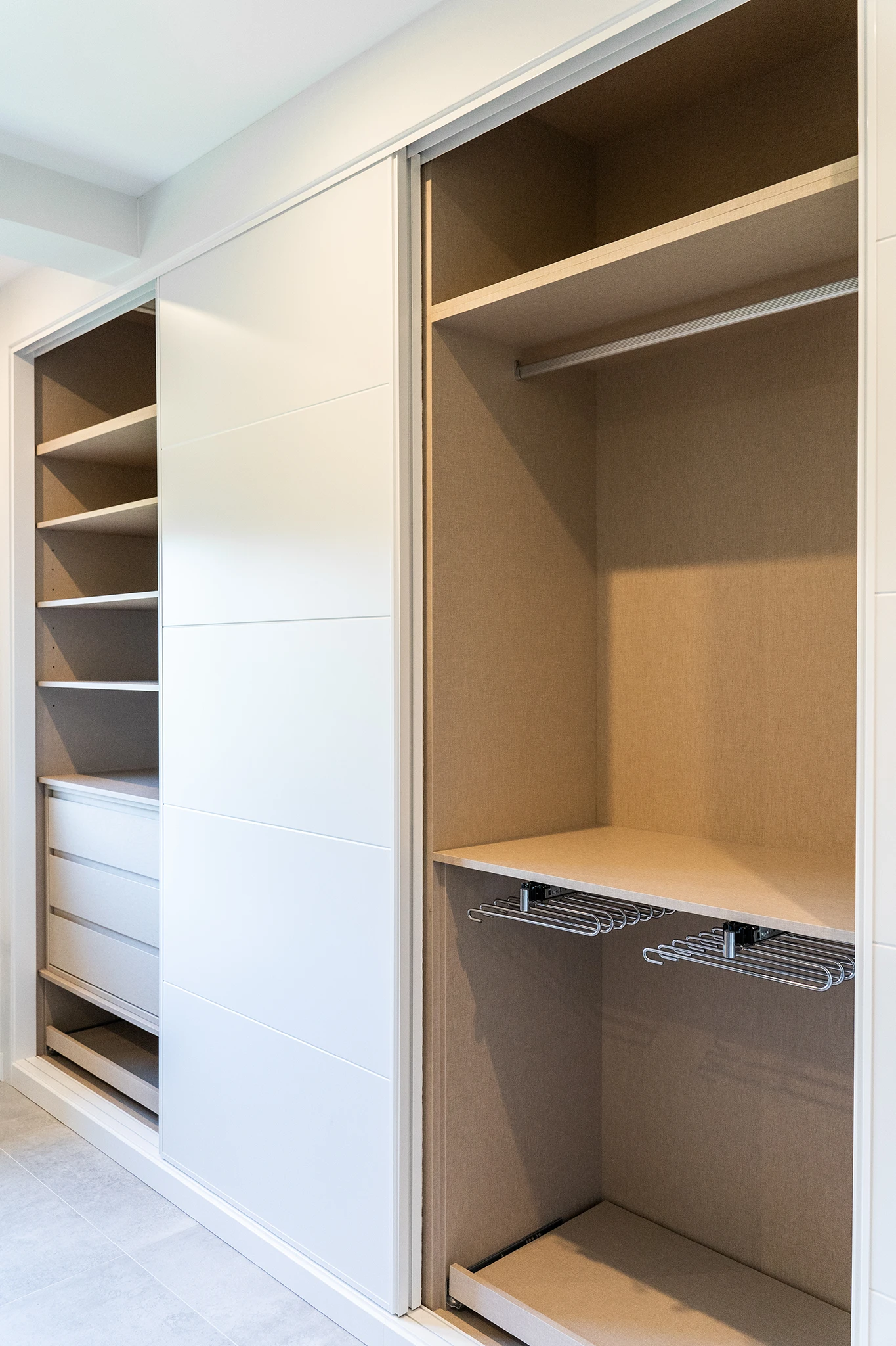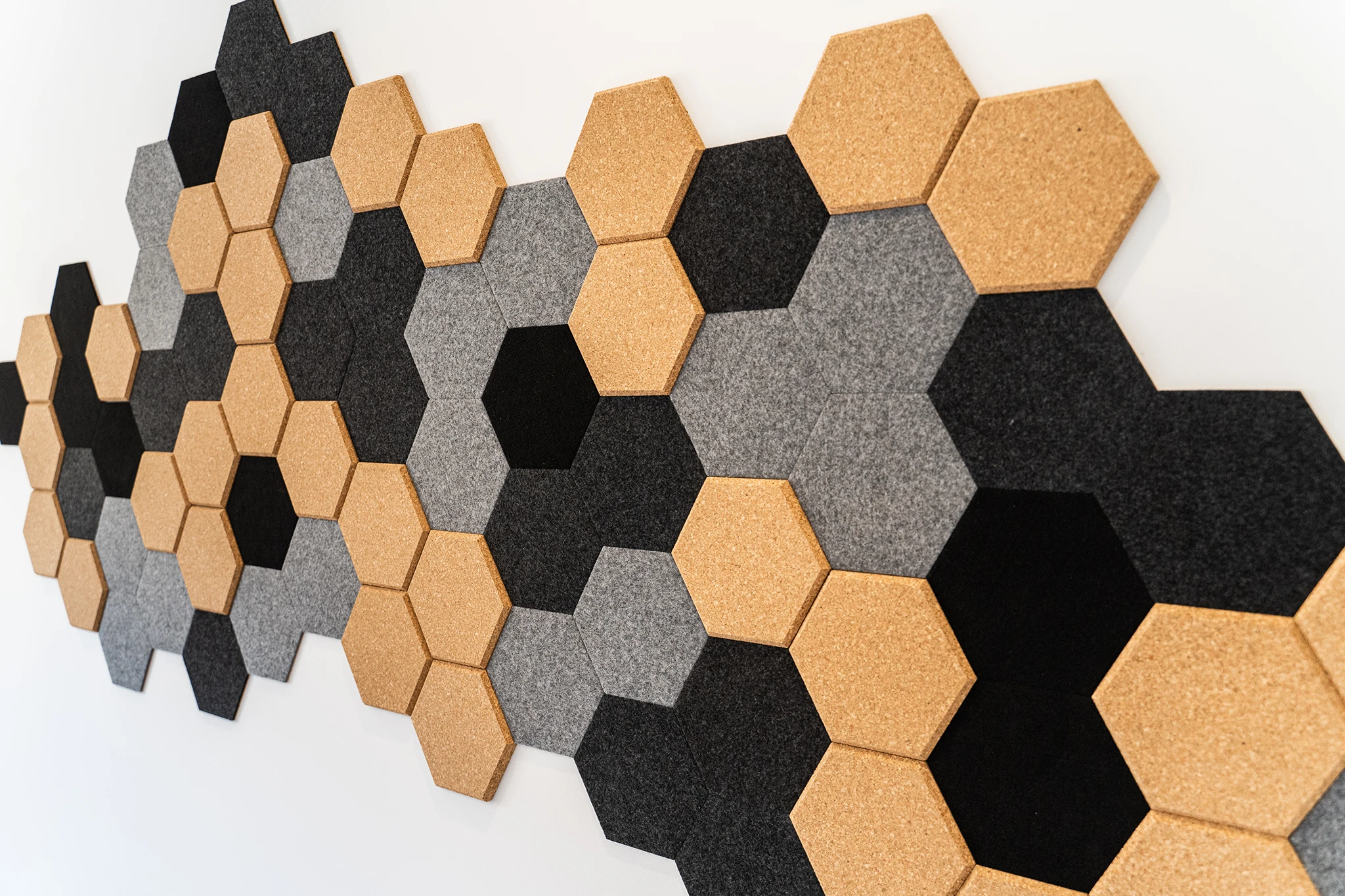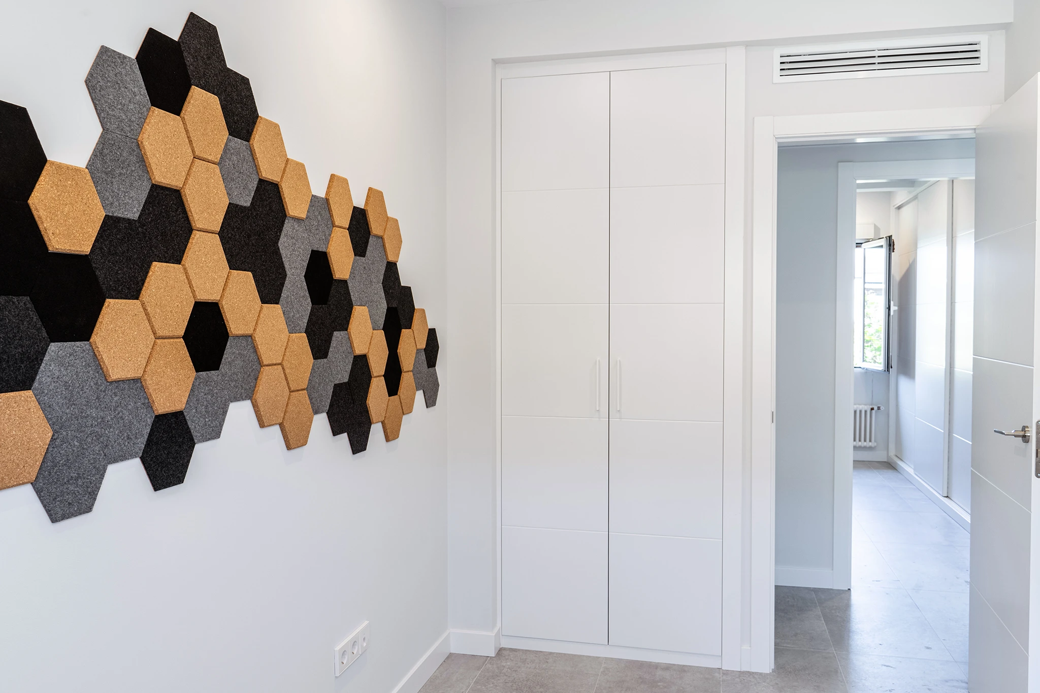 Por último, se amplían los dormitorios dejando únicamente dos. El dormitorio principal se completa con un gran armario vestidor y en el dormitorio secundario, que tendrá función de estudio y dormitorio de invitados, se coloca un panel pared de corchos hexagonales para apoyo a la zona de trabajo.