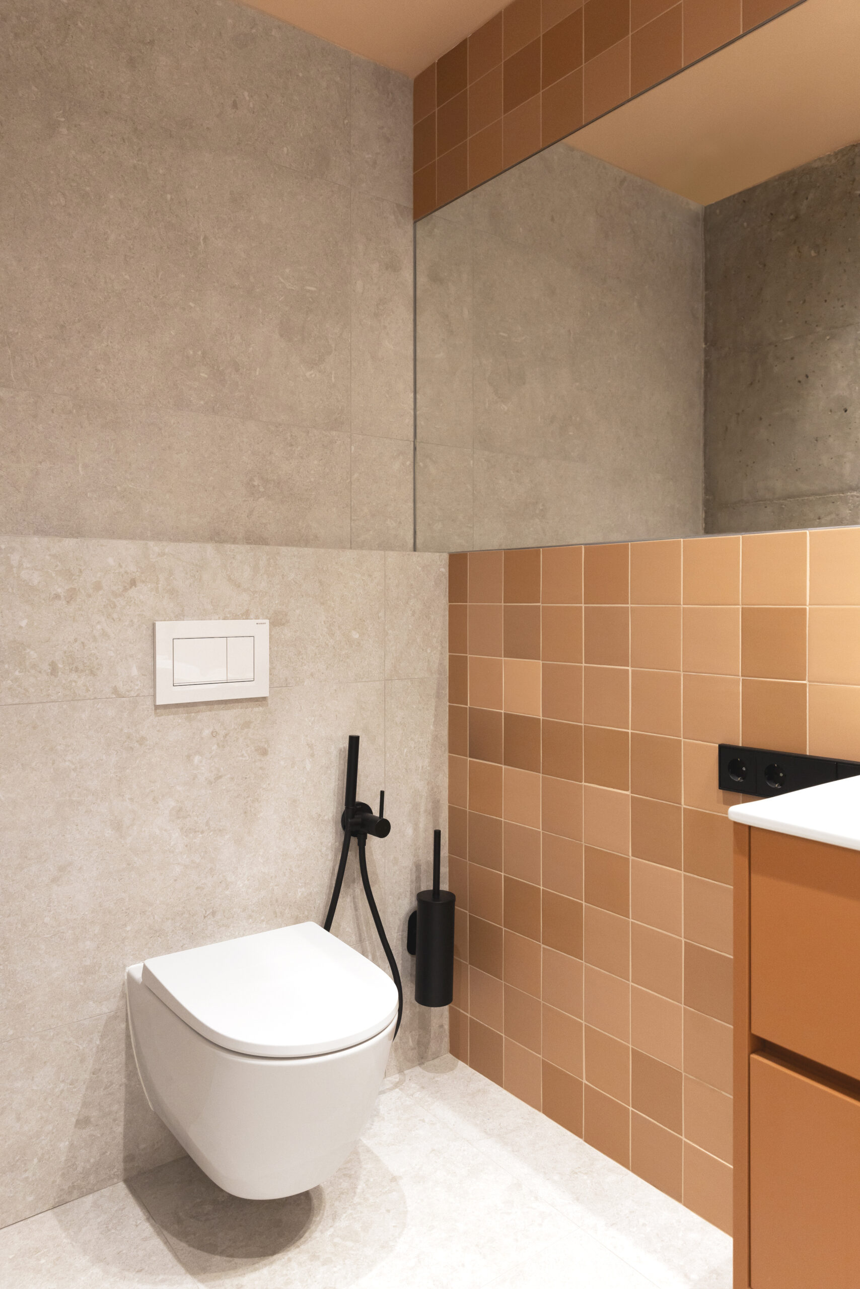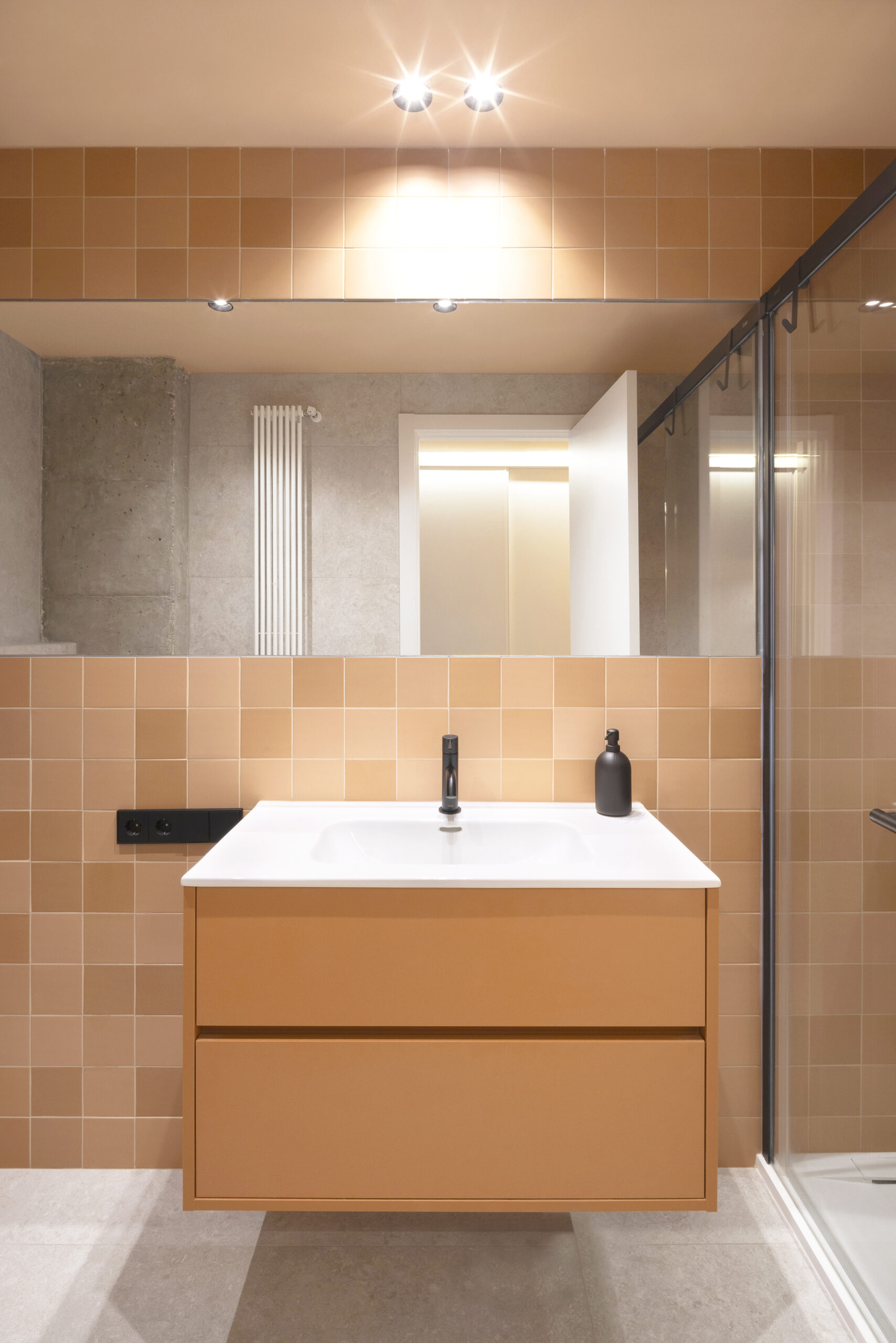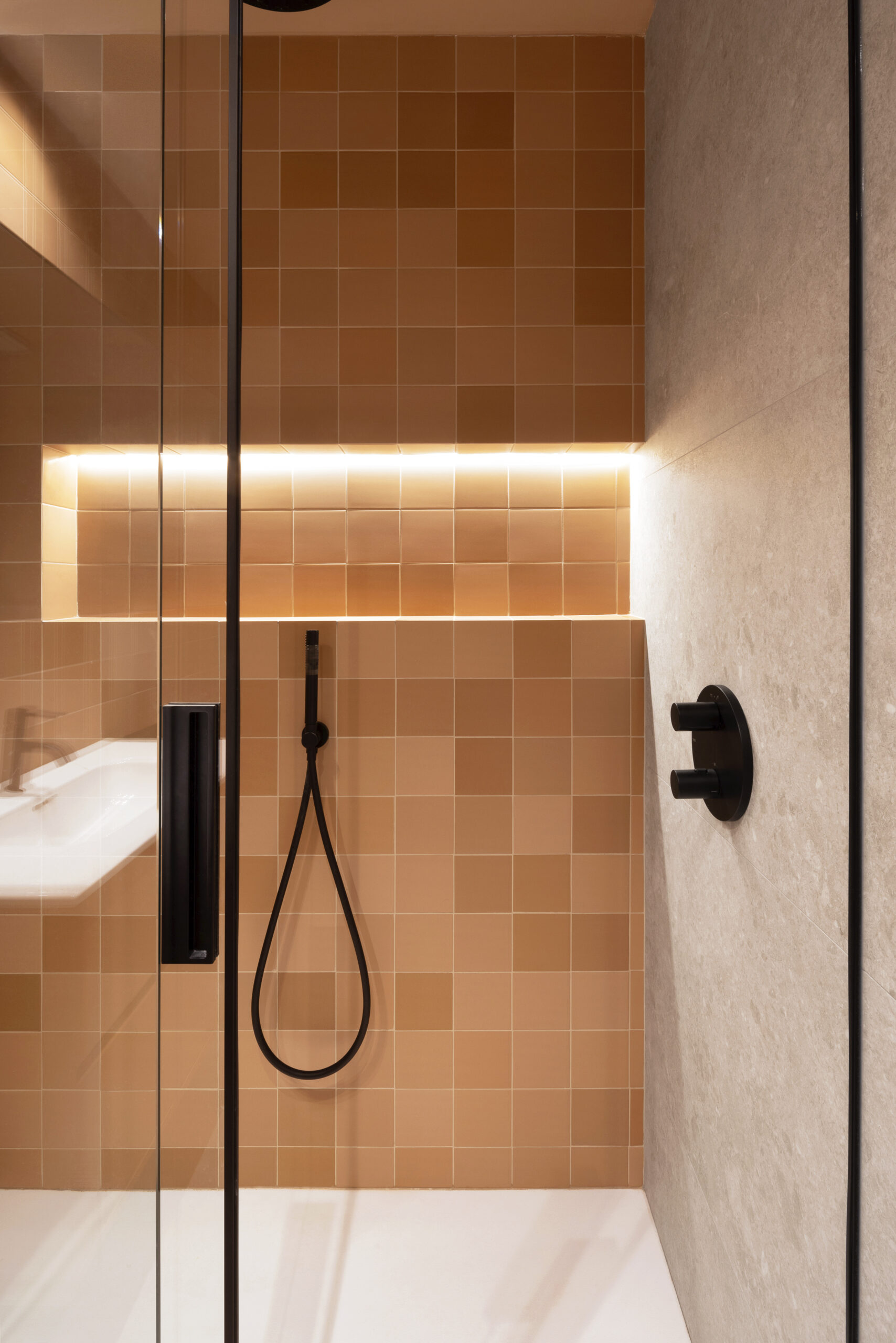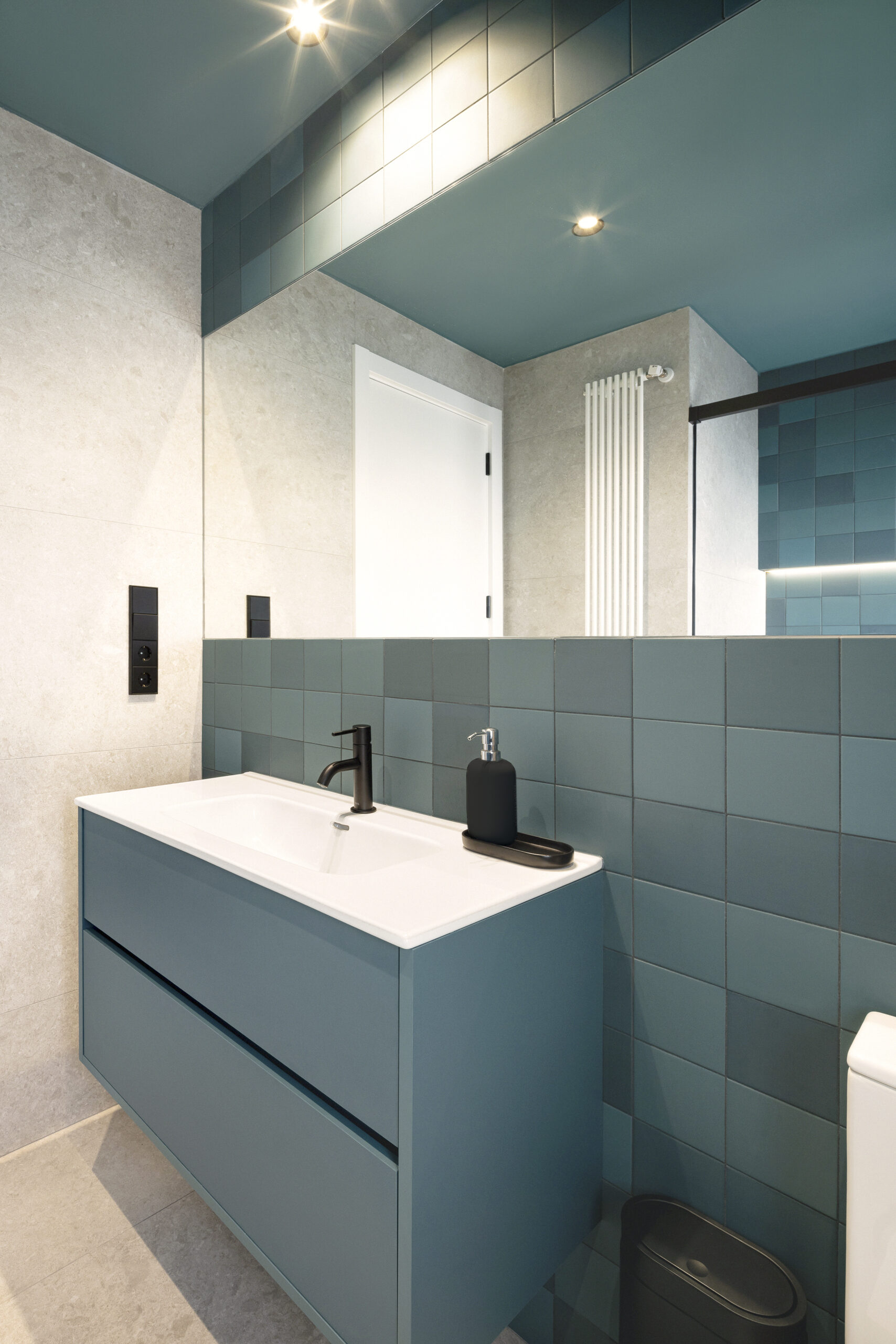 Por último, se decide también aportar color en los baños, manteniéndose como en el resto de la vivienda los acabados cerámicos y los tonos claros. Se opta por un alicatado en pequeño formato, con colores cálidos pastel en el baño principal y todos azules más fríos en el de invitados. Se aporta un punto de contraste con el uso de griferías y mamparas negras y de diseño con las hornacinas iluminadas desde su interior.