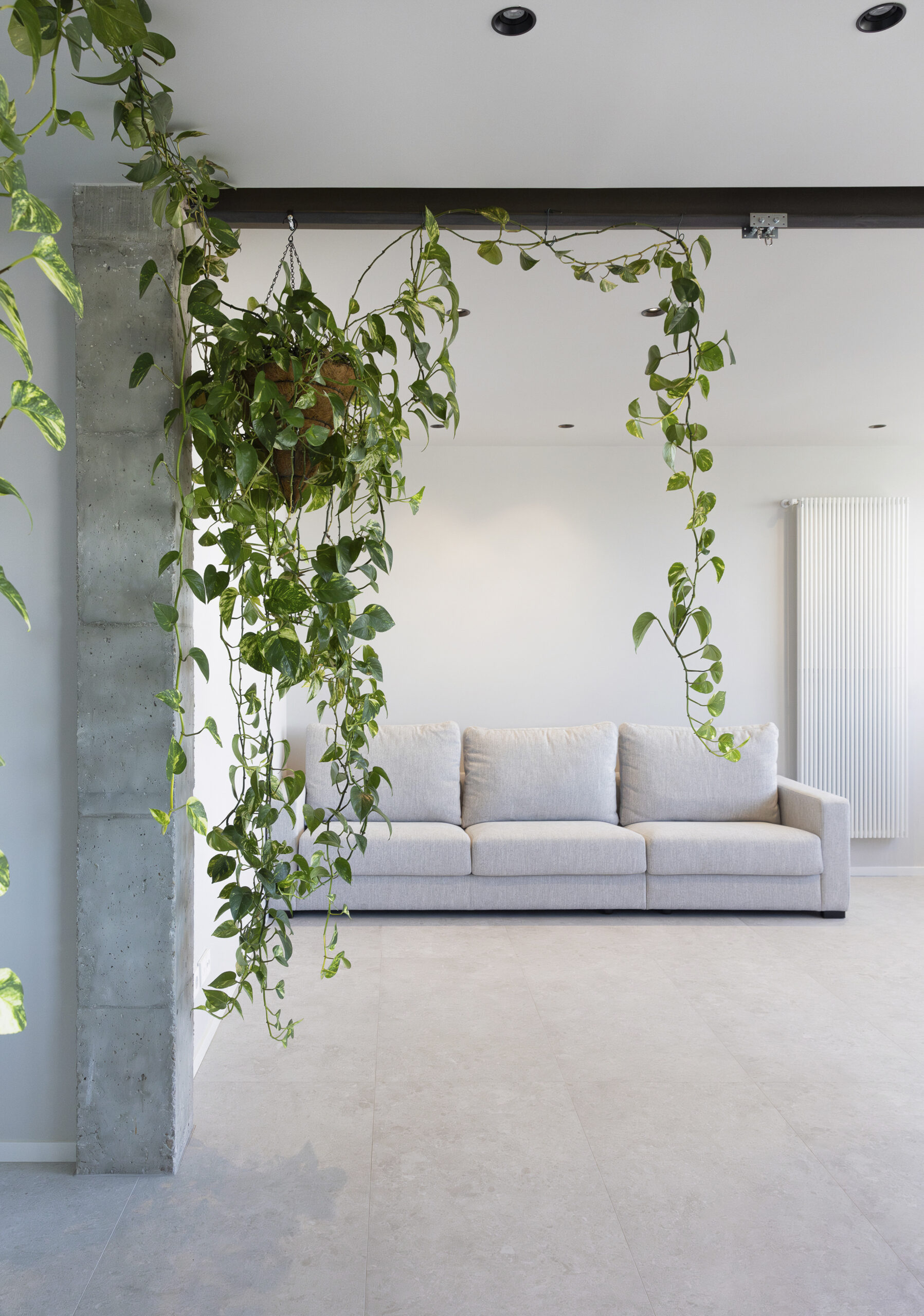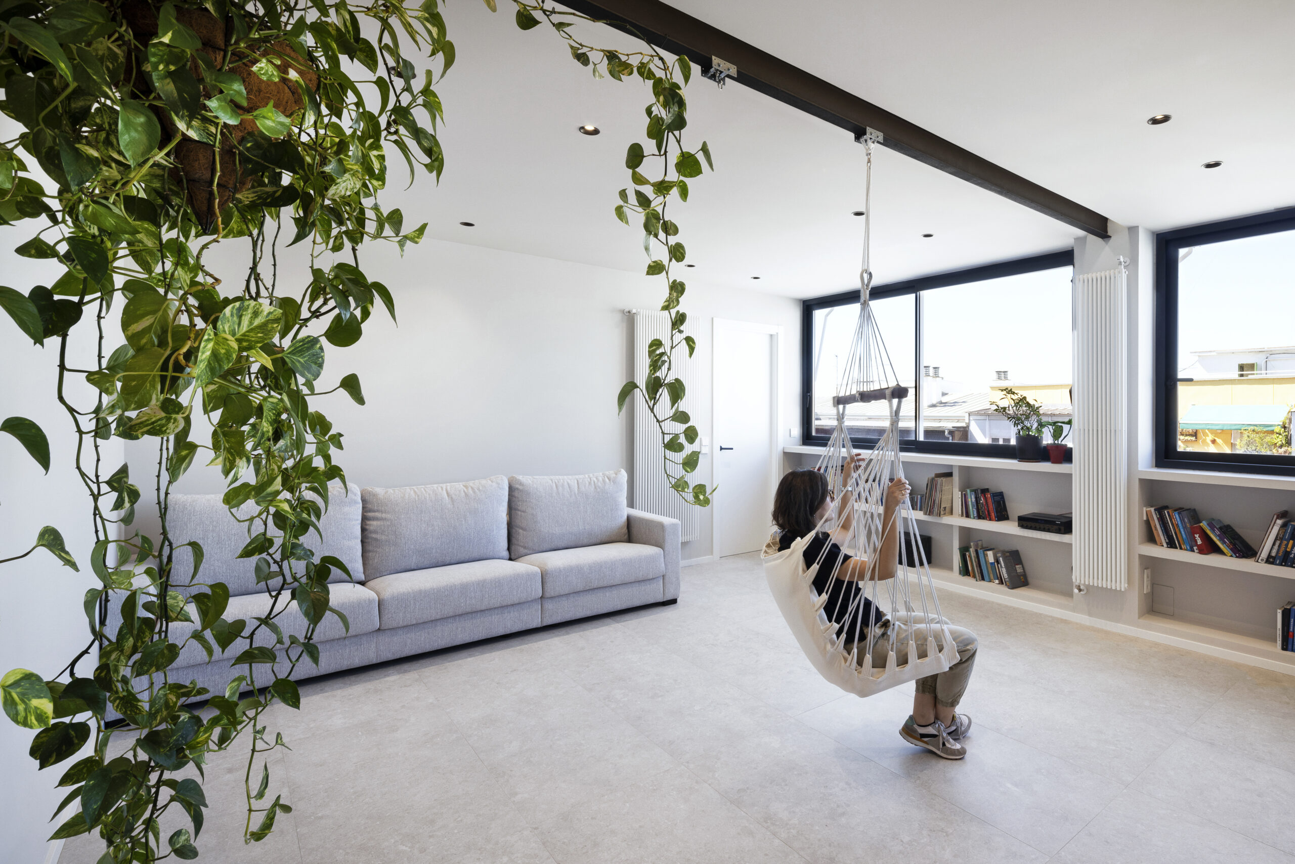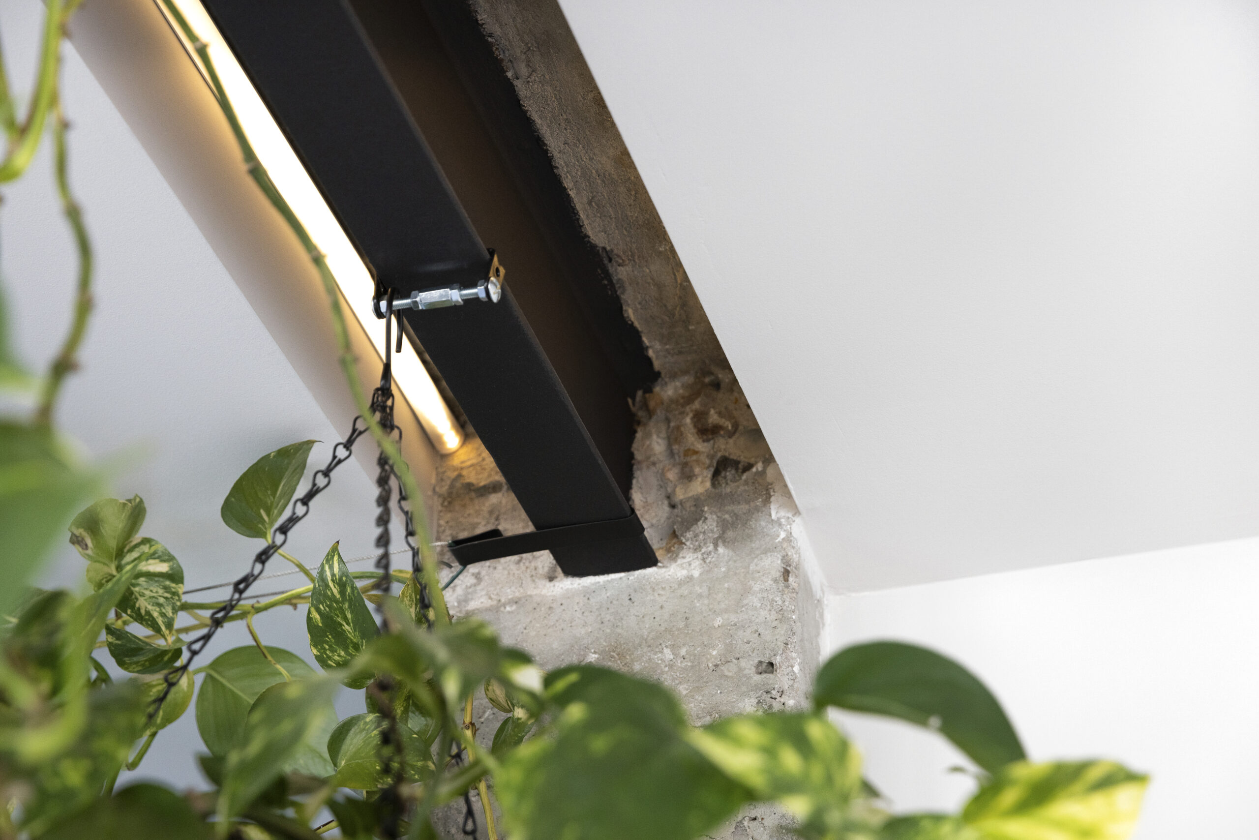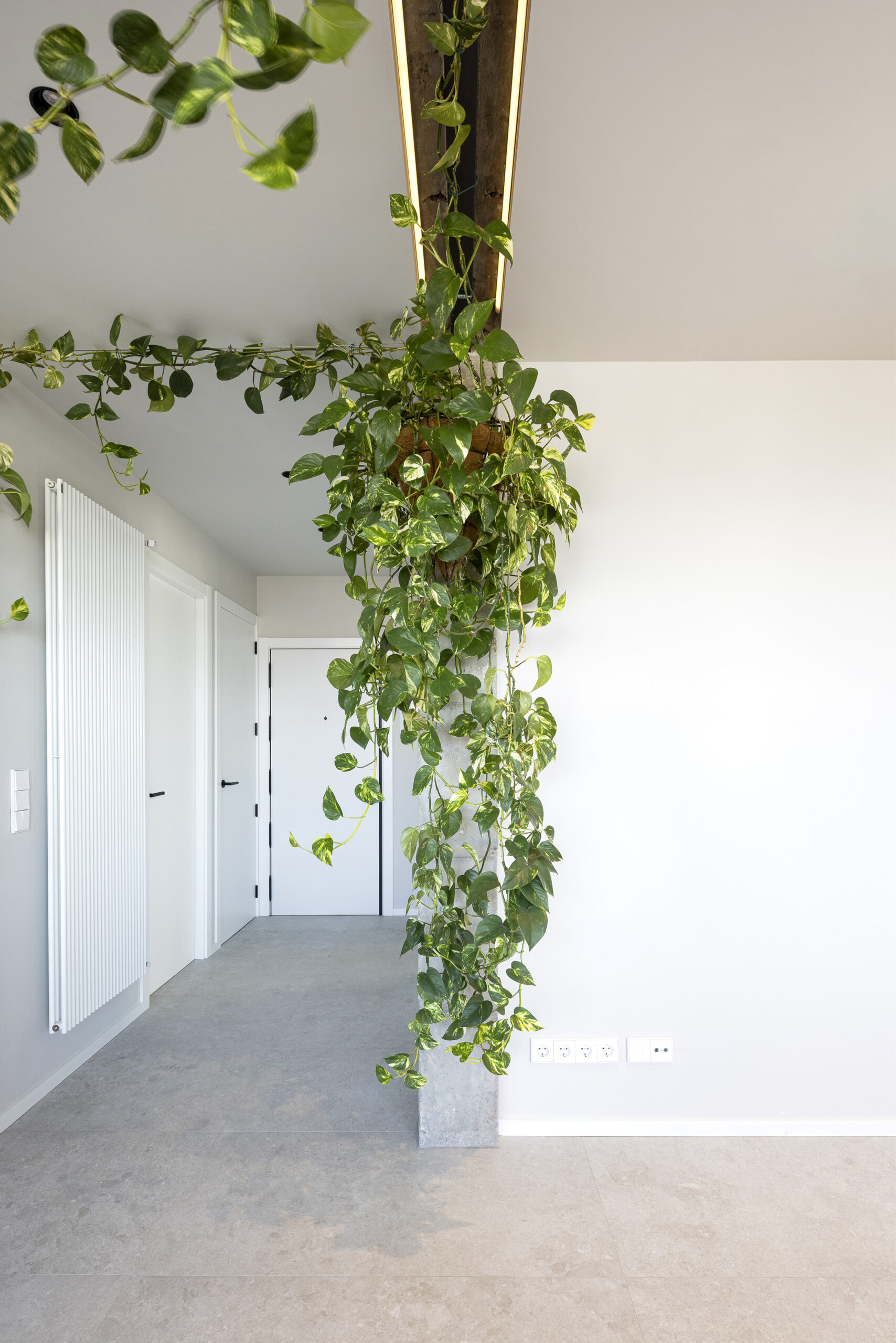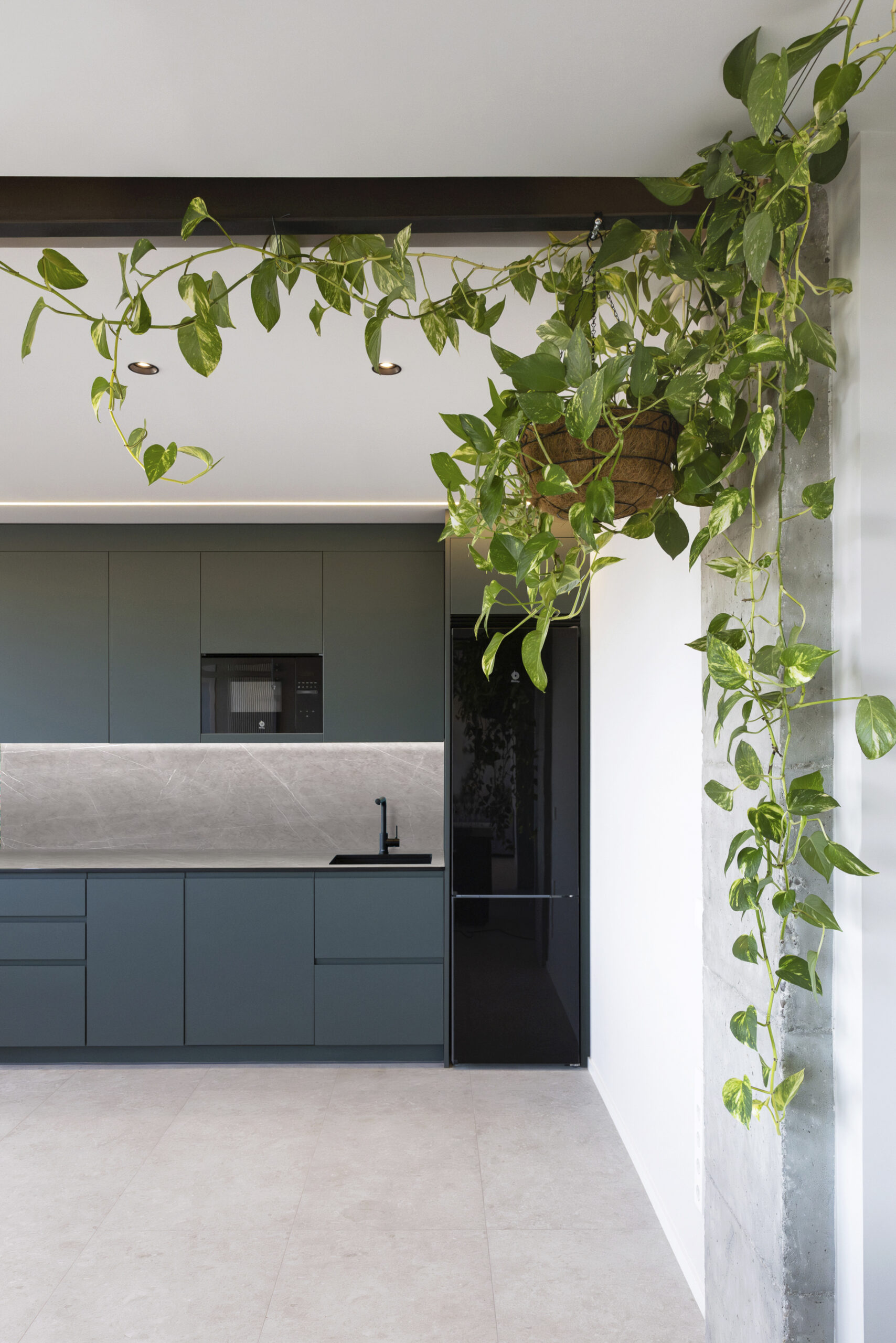 La homogeneidad en los acabados se rompe con la vegetación, que cobra importancia en la decoración del espacio principal, con plantas que cuelgan de la estructura vista. La cocina ocupa por completo la pared de uno de los laterales del espacio central. Se decide un acabado en tonos verdes en sintonía con la importancia de las plantas en la vivienda. El espacio entre muebles se resuelve con un fondal más oscuro que destaque sobre el resto de acabados.