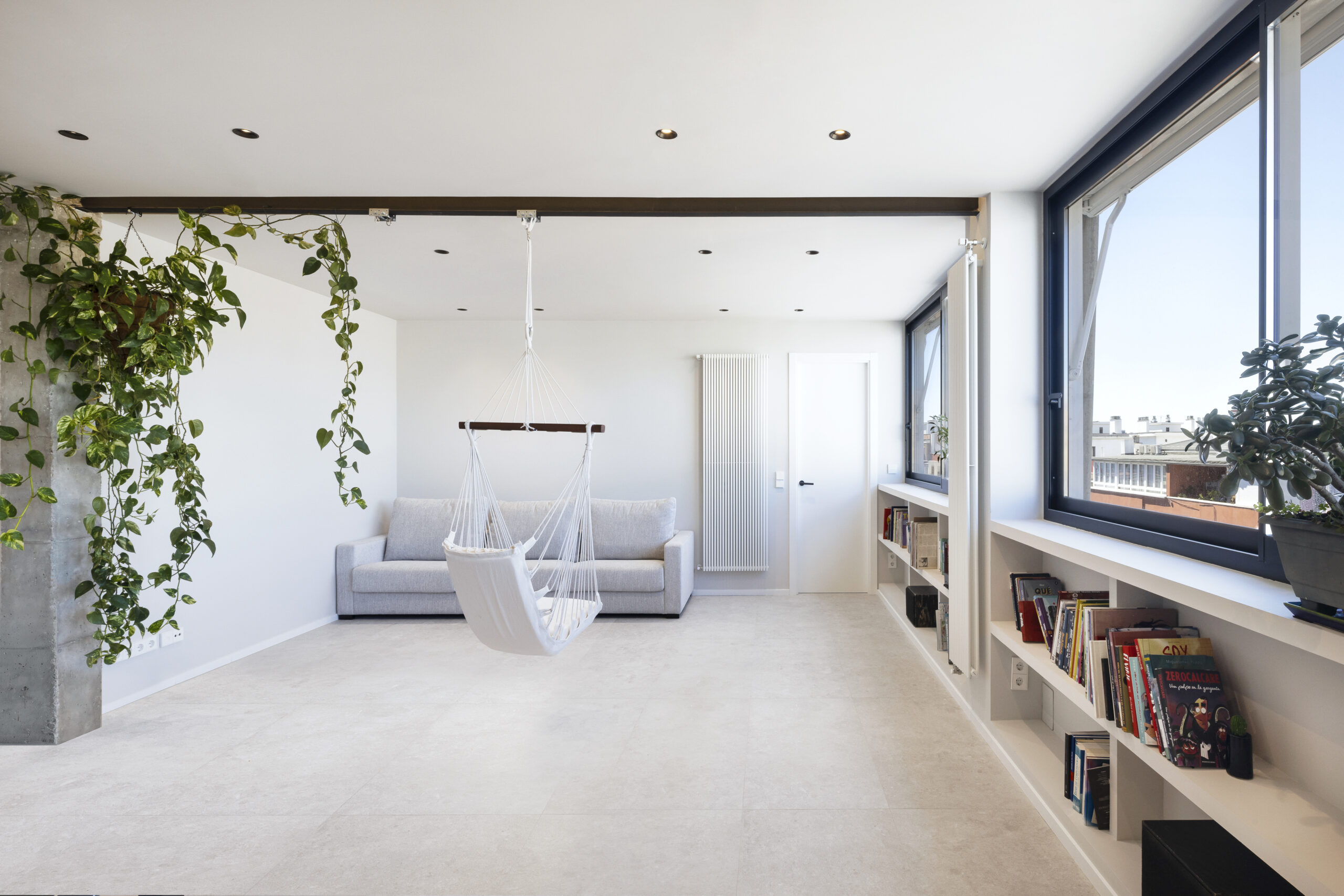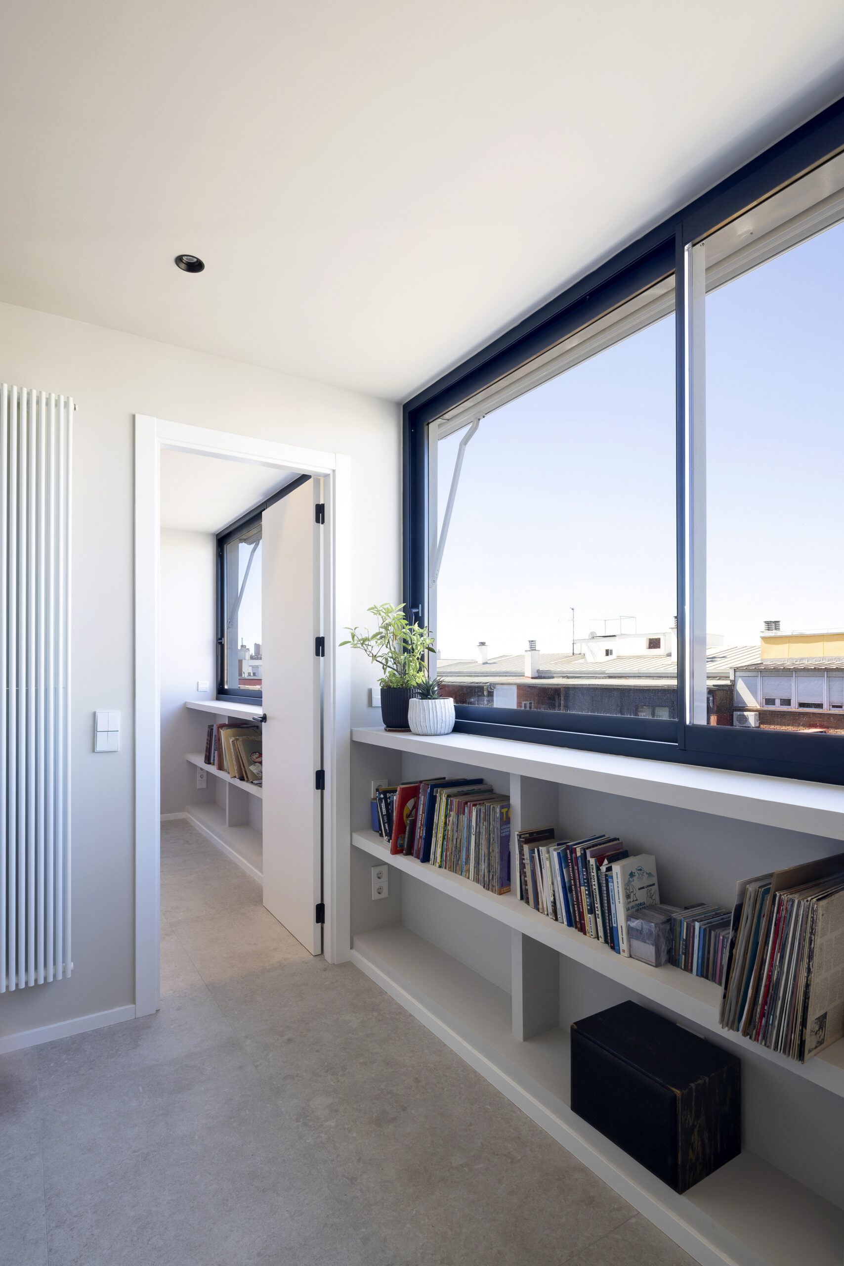 La vivienda dispone, en su fachada principal, de un gran ventanal orientado a Sur. El núcleo central de la casa se vuelca hacia este ventanal aportándole una gran luminosidad, la luz se potencia con los tonos claros utilizados en los acabados de las paredes y el solado cerámico que tiene continuidad en todas las estancias. El diseño minimalista busca dar protagonismo a la estructura existente del edificio, tanto en las vigas de acero que sustentan la cubierta como en los pilares de hormigón. Se descubre la estructura dejando vistos los pilares de hormigón que mantienen los tonos claros protagonistas en el resto de la casa y buscando un contraste en las vigas metálicas acabándolas en esmalte de color negro.
