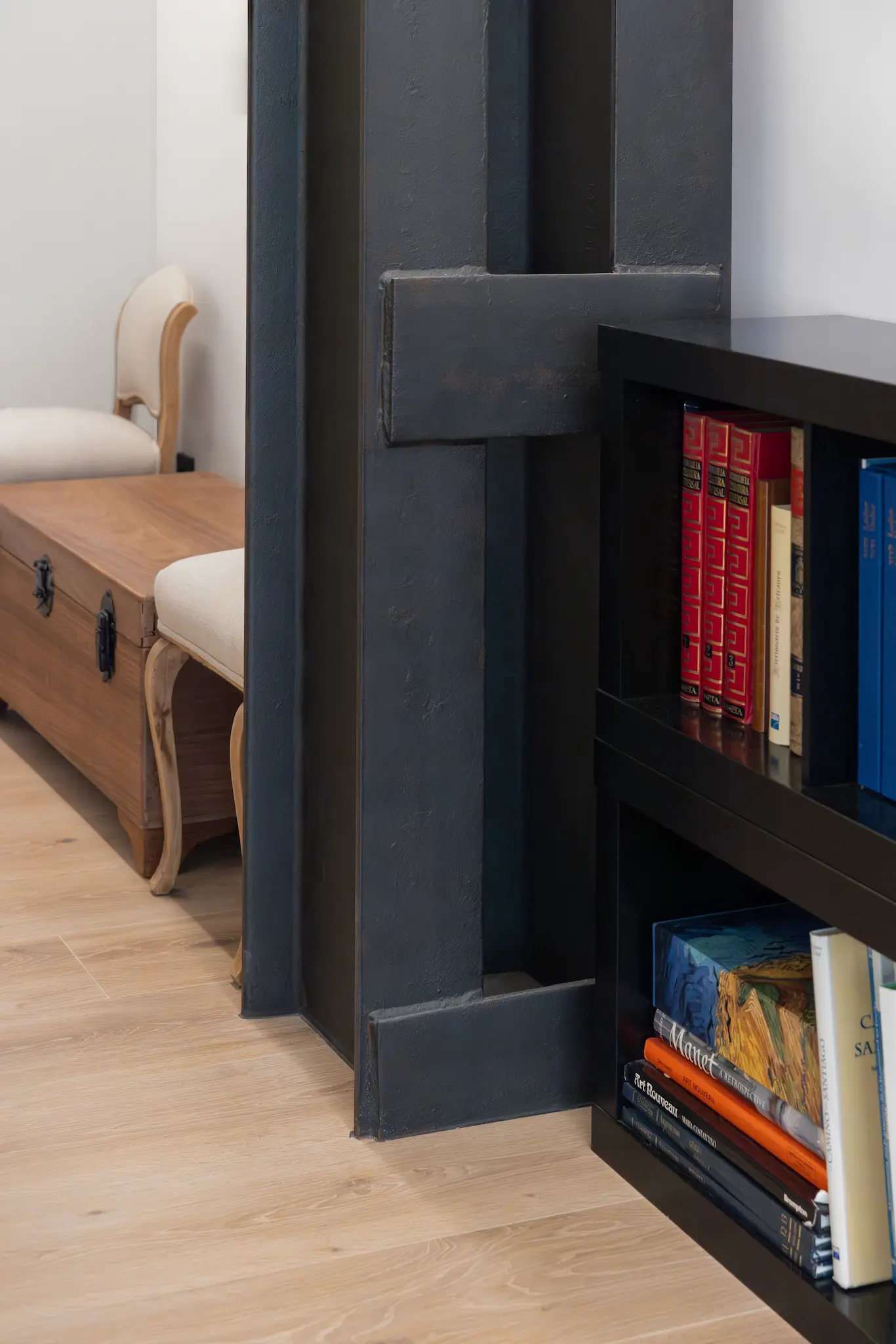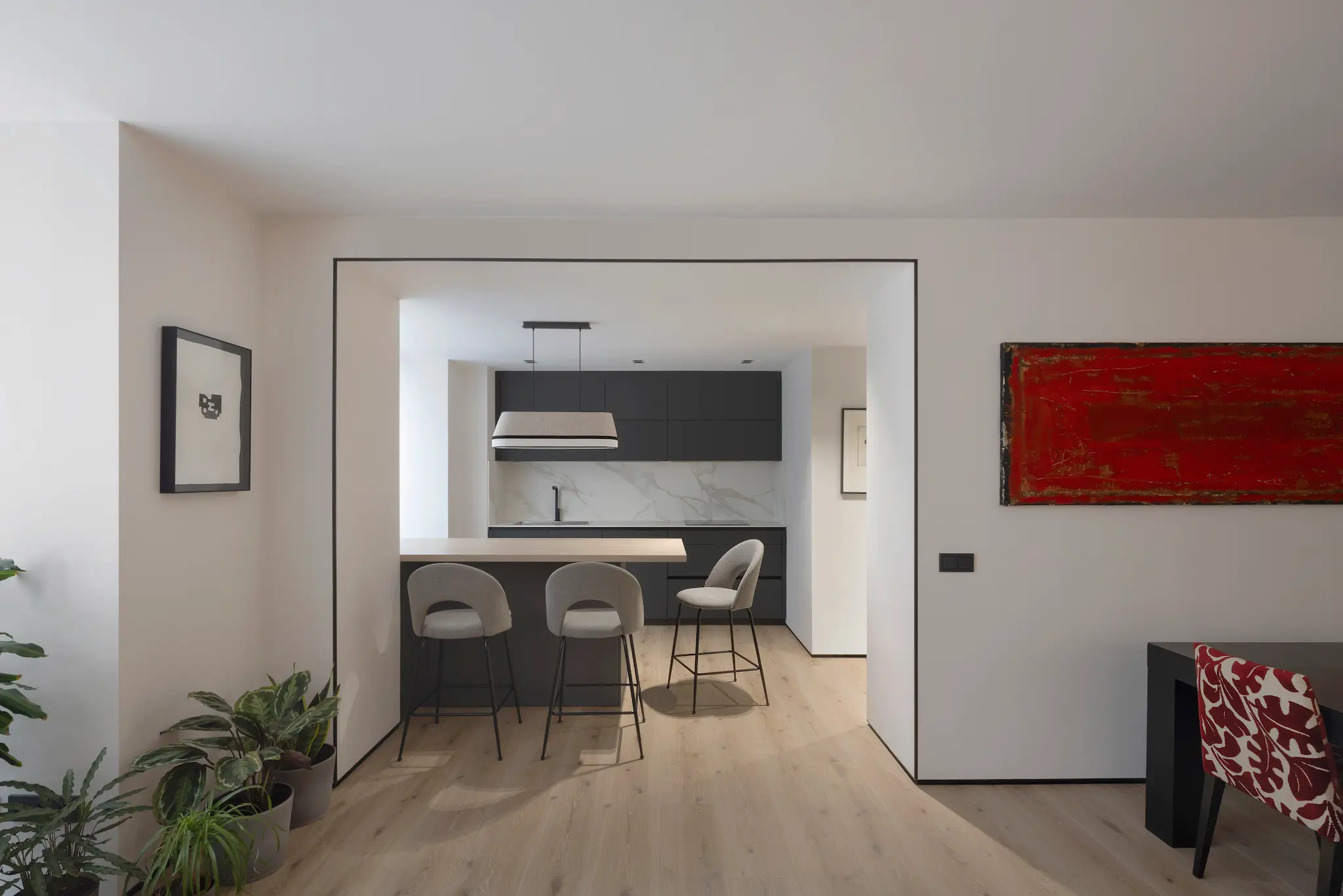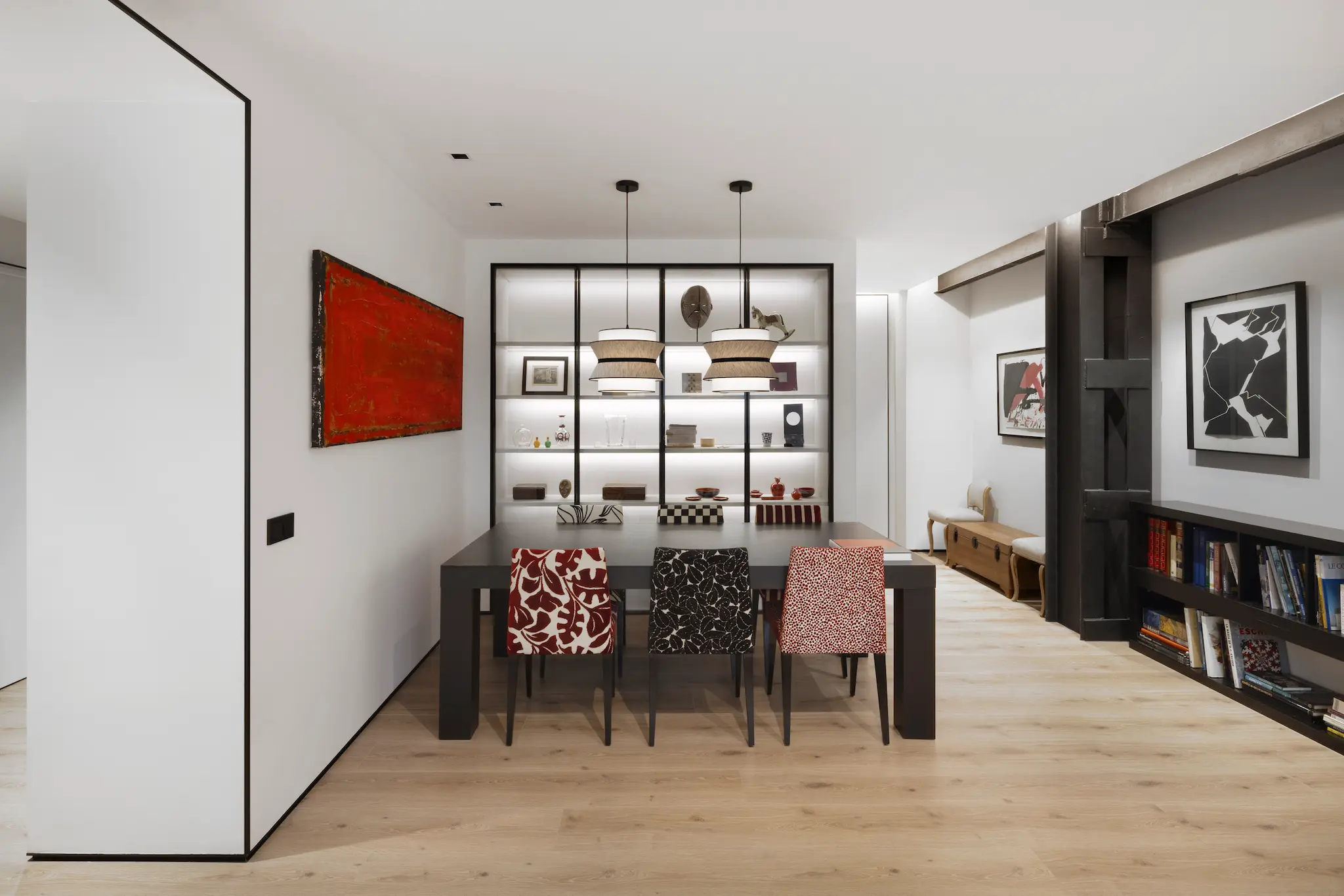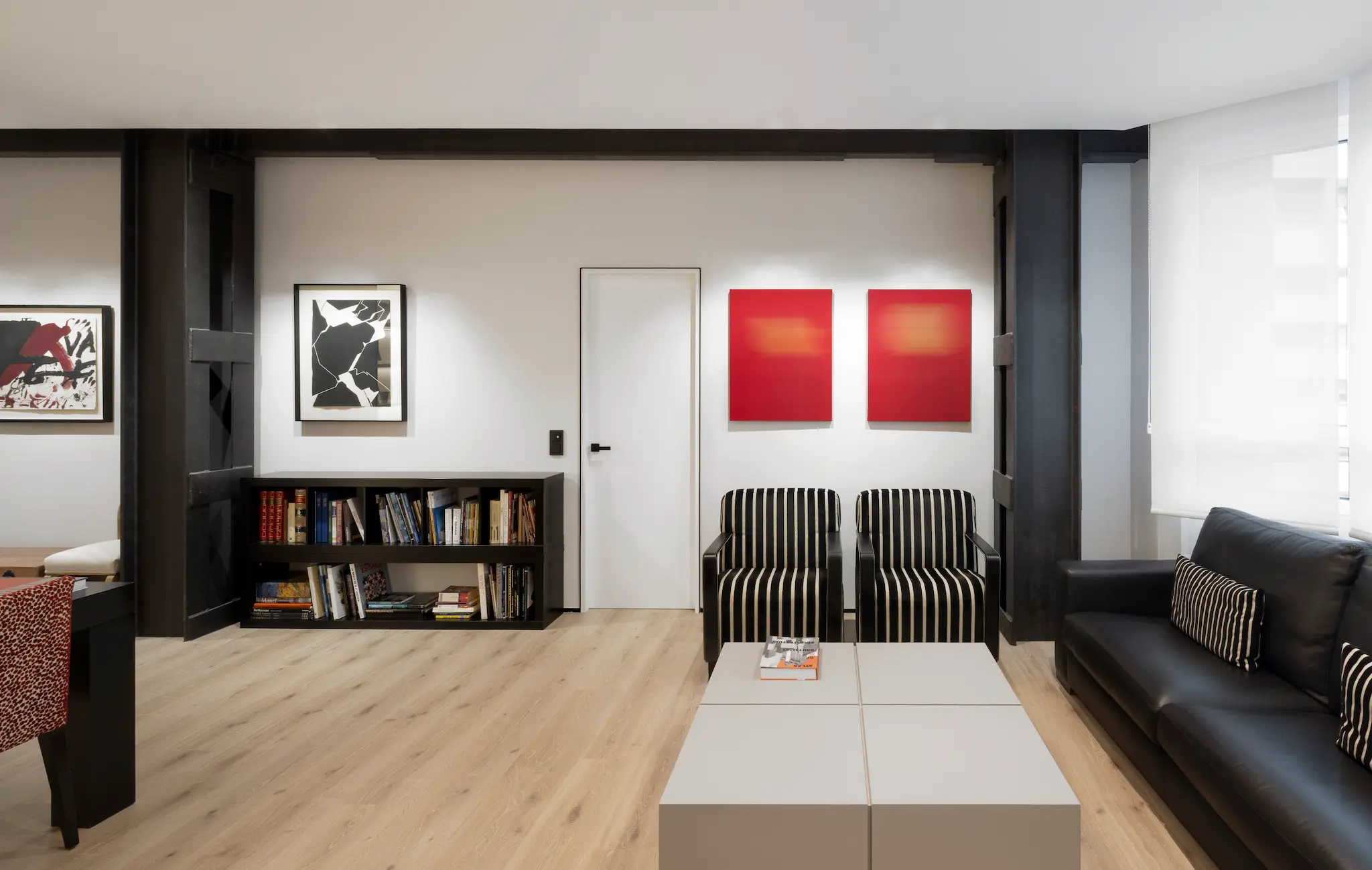 Su definida personalidad nos llevó a estudiar detalles que encajaran con lo que nos transmitía, así, repensamos toda la carpintería y sus encuentros. La gama cromática de la vivienda gira en torno a tres colores puros, blanco, negro y rojo. Empleamos un perfil negro esbelto para sustituir el rodapié convencional y los marcos de las puertas, apenas una línea negra en contraste con la potente estructura de vigas y pilares que dejamos vista, un contenedor de líneas sutiles que cediese el protagonismo a todos sus objetos.