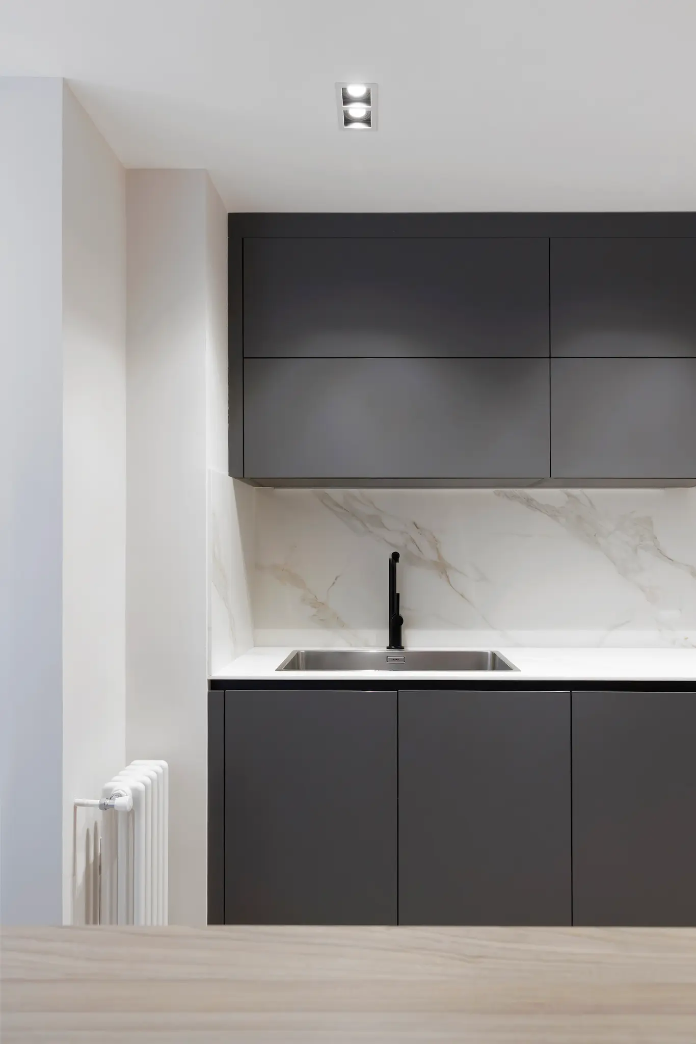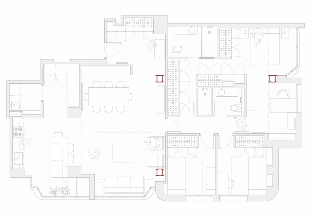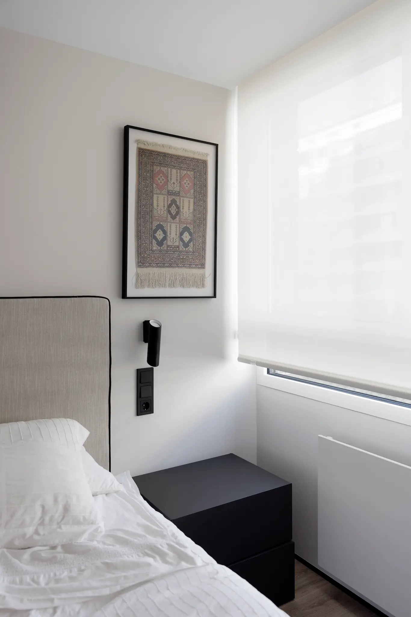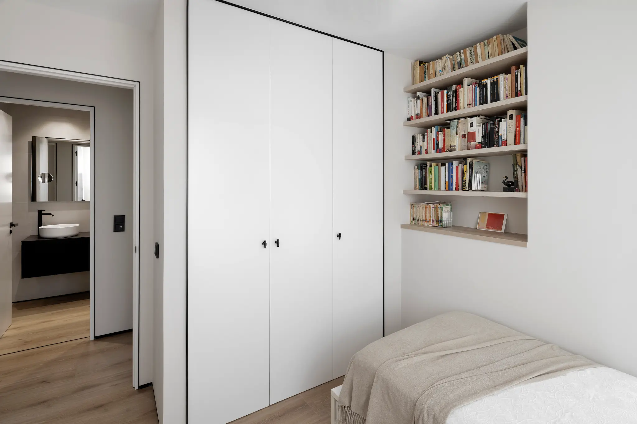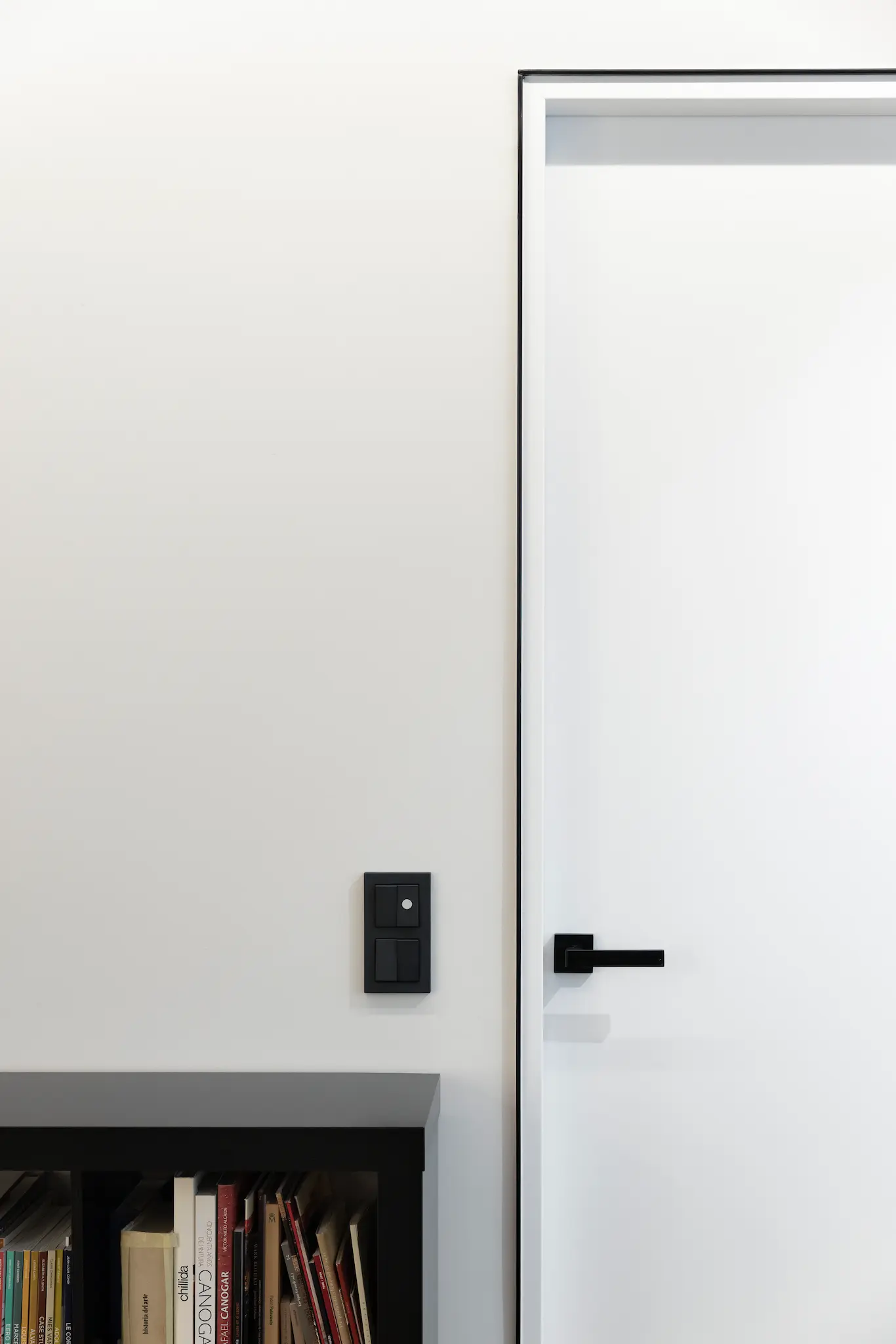 Su definida personalidad nos llevó a estudiar detalles que encajaran con lo que nos transmitía, así, repensamos toda la carpintería y sus encuentros. La gama cromática de la vivienda gira en torno a tres colores puros, blanco, negro y rojo. Empleamos un perfil negro esbelto para sustituir el rodapié convencional y los marcos de las puertas, apenas una línea negra en contraste con la potente estructura de vigas y pilares que dejamos vista, un contenedor de líneas sutiles que cediese el protagonismo a todos sus objetos.