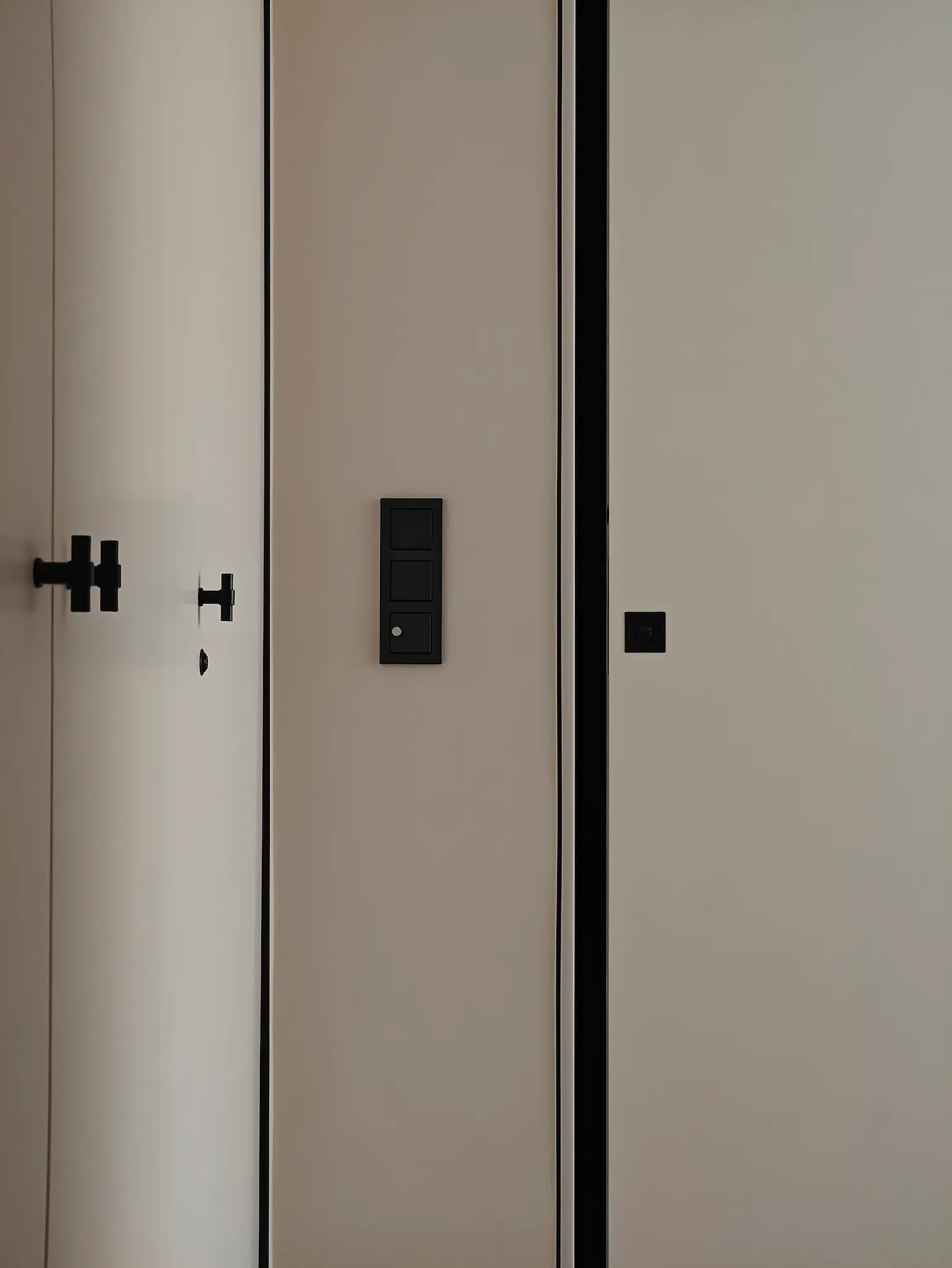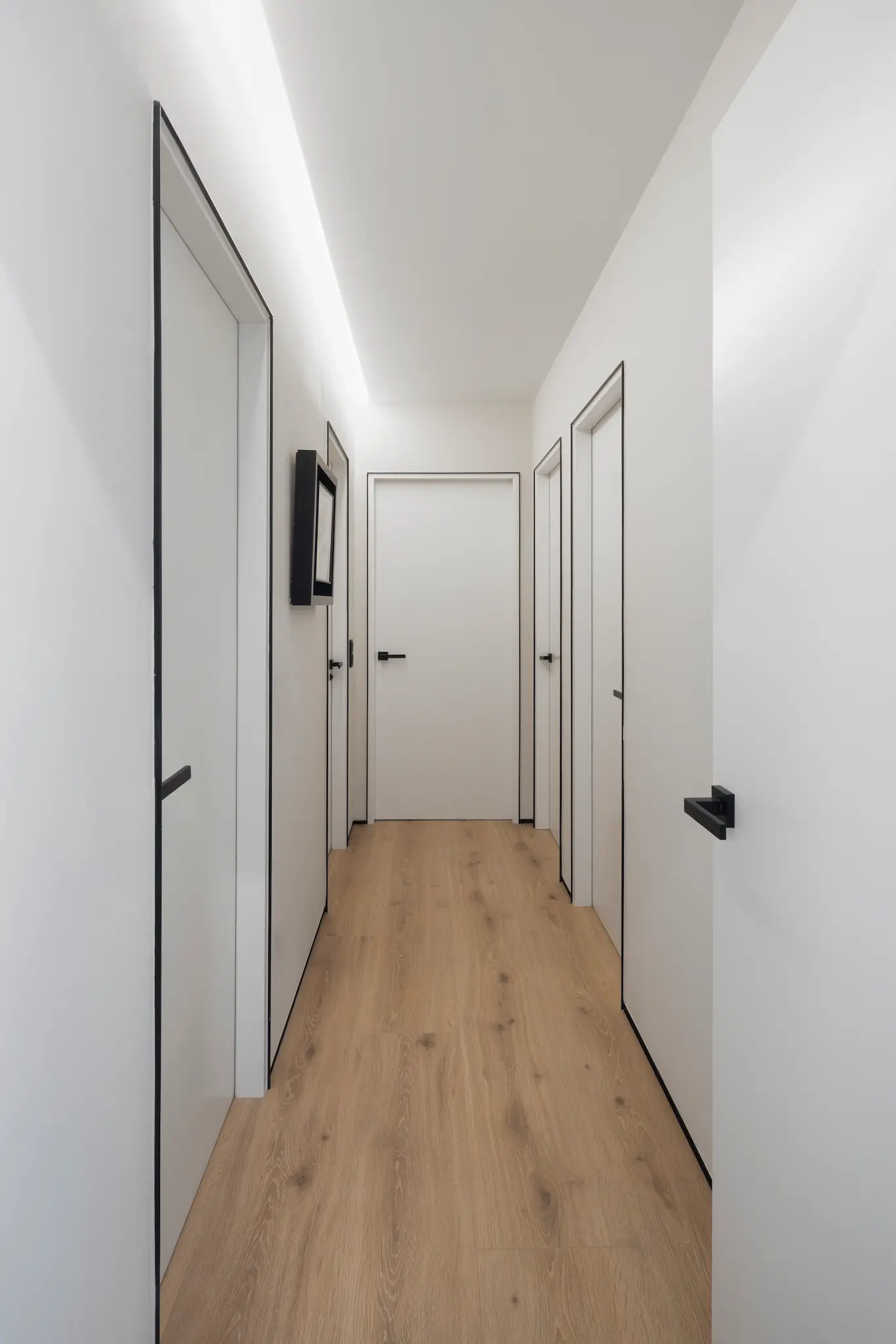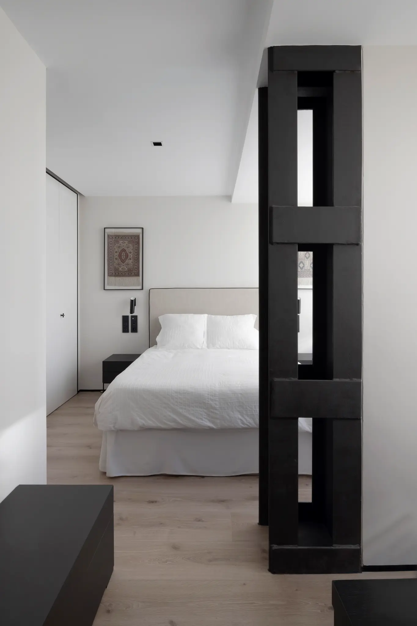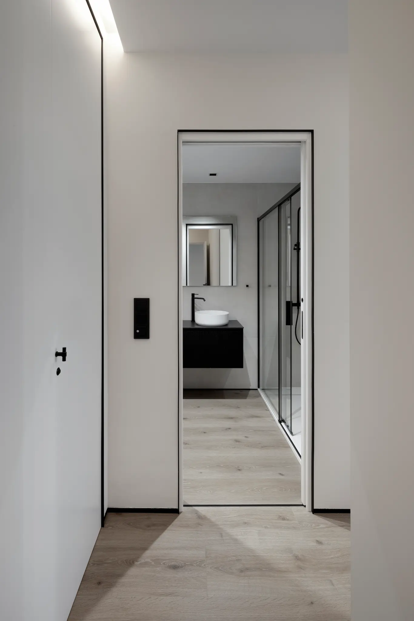 Su definida personalidad nos llevó a estudiar detalles que encajaran con lo que nos transmitía, así, repensamos toda la carpintería y sus encuentros. La gama cromática de la vivienda gira en torno a tres colores puros, blanco, negro y rojo. Empleamos un perfil negro esbelto para sustituir el rodapié convencional y los marcos de las puertas, apenas una línea negra en contraste con la potente estructura de vigas y pilares que dejamos vista, un contenedor de líneas sutiles que cediese el protagonismo a todos sus objetos.