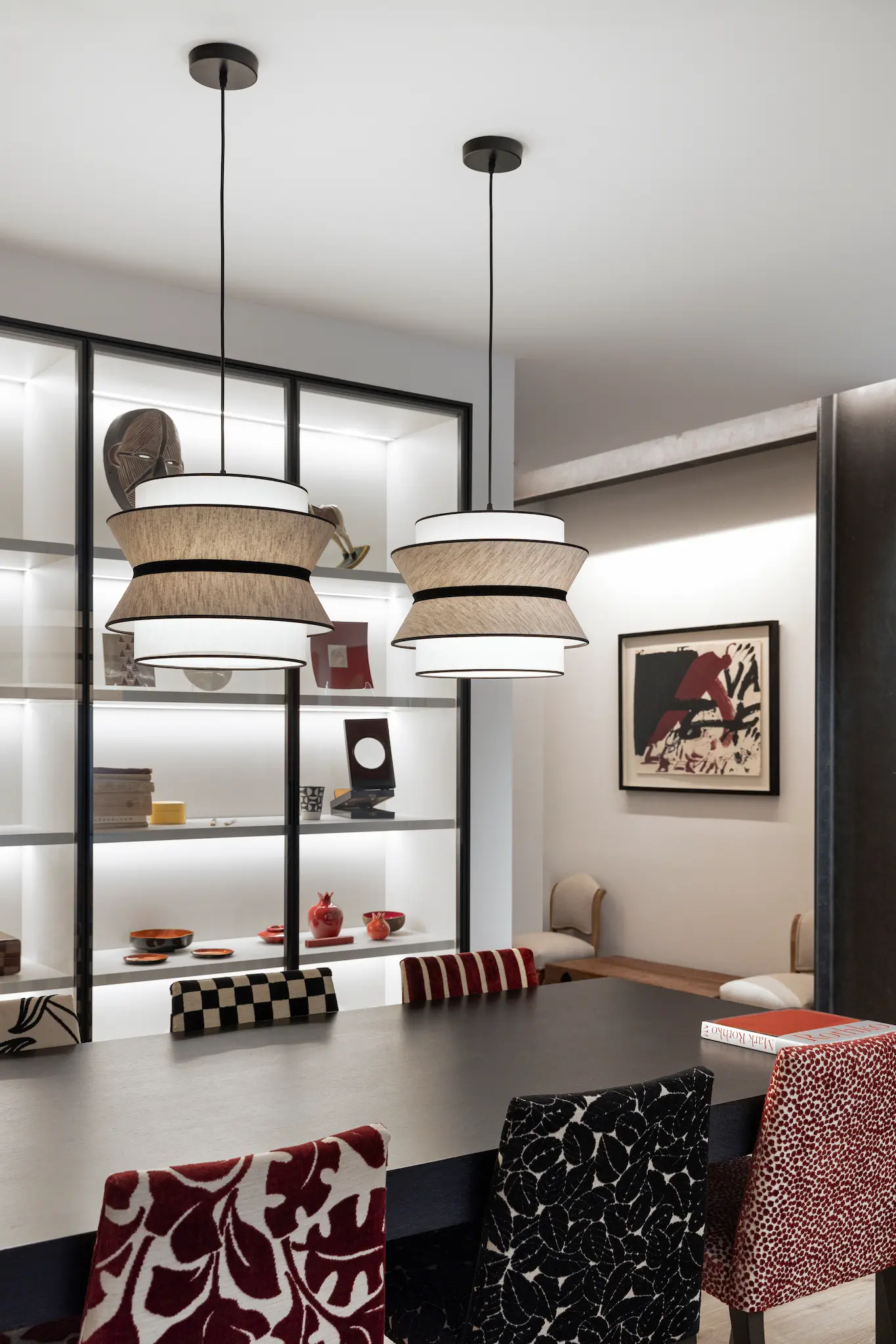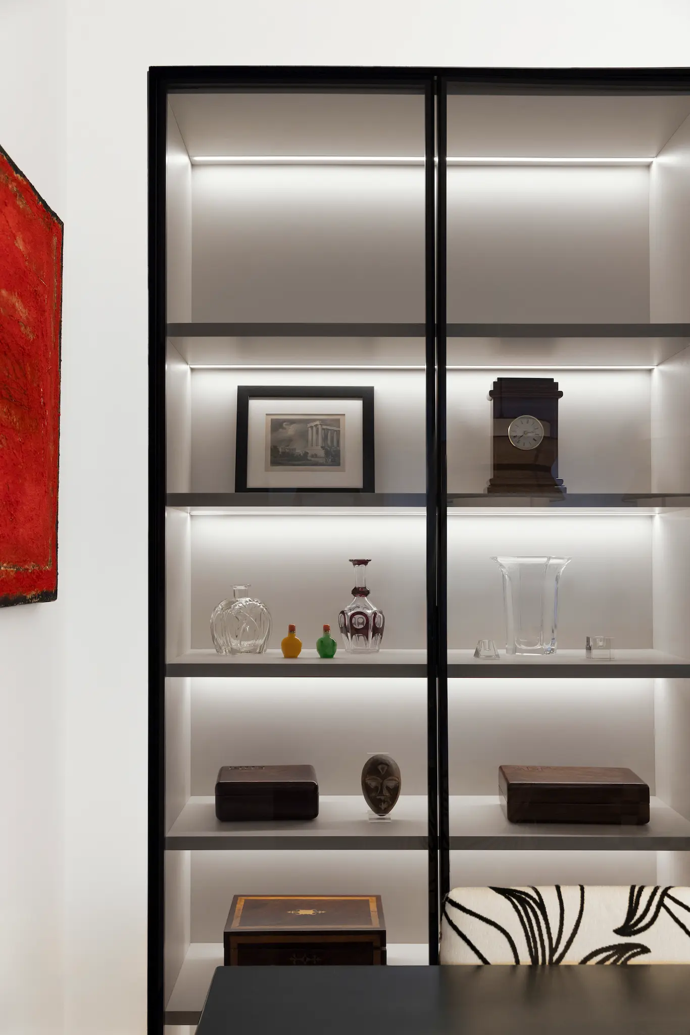 Las luminarias suspendidas y el suelo de madera encajan en otro tipo de decoración y suponen el contraste amable al brutalismo presente en esta obra. La iluminación LED integrada en los falsos techos baña las paredes de armarios y pasillos con una luz suave pensada para que se habite de noche, y marque amablemente los recorridos. En el salón se emplea también para destacar la potencia estructural de la vivienda, y dentro de la vitrina, para reflejar la importancia de todos los objetos contenidos en ella.