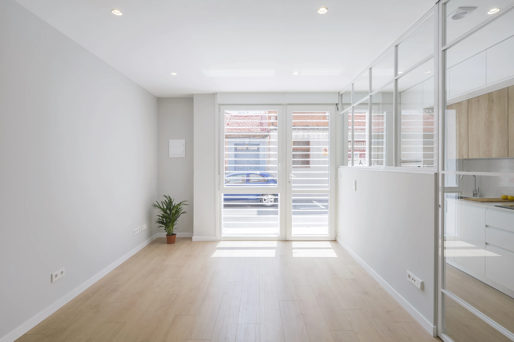 En esta ocasión trabajamos sobre un proyecto realizado por el arquitecto Daniel Cabrera. El origen es un local en Carabanchel totalmente diáfano, con escasa iluminación y a pie de calle que la propiedad quiere convertir en vivienda. El objetivo principal es conseguir una mayor iluminación y para ello se interviene en ambas fachadas abriendo nuevos huecos y empleando carpinterías de una sola hoja con sección mínima.
