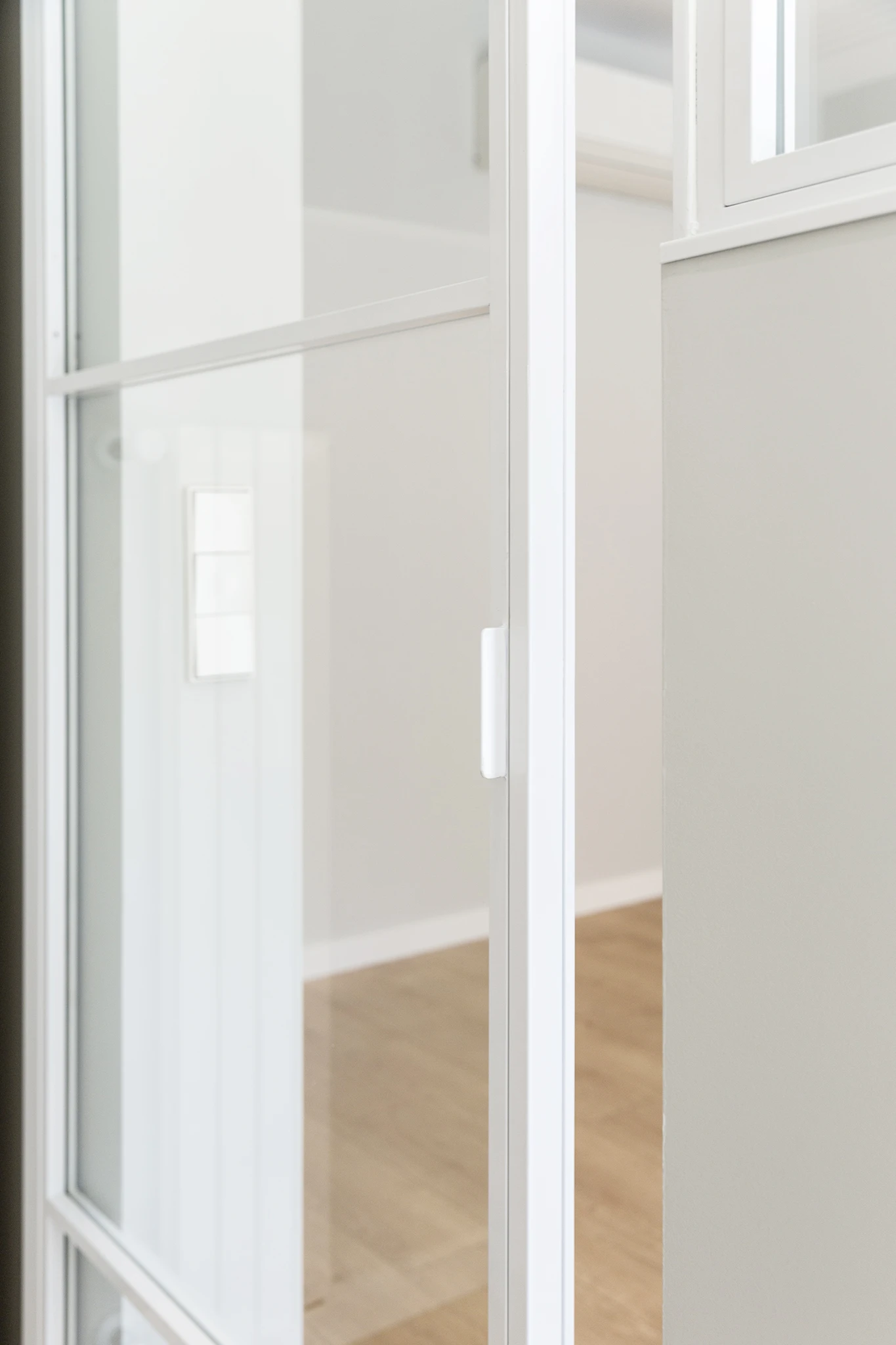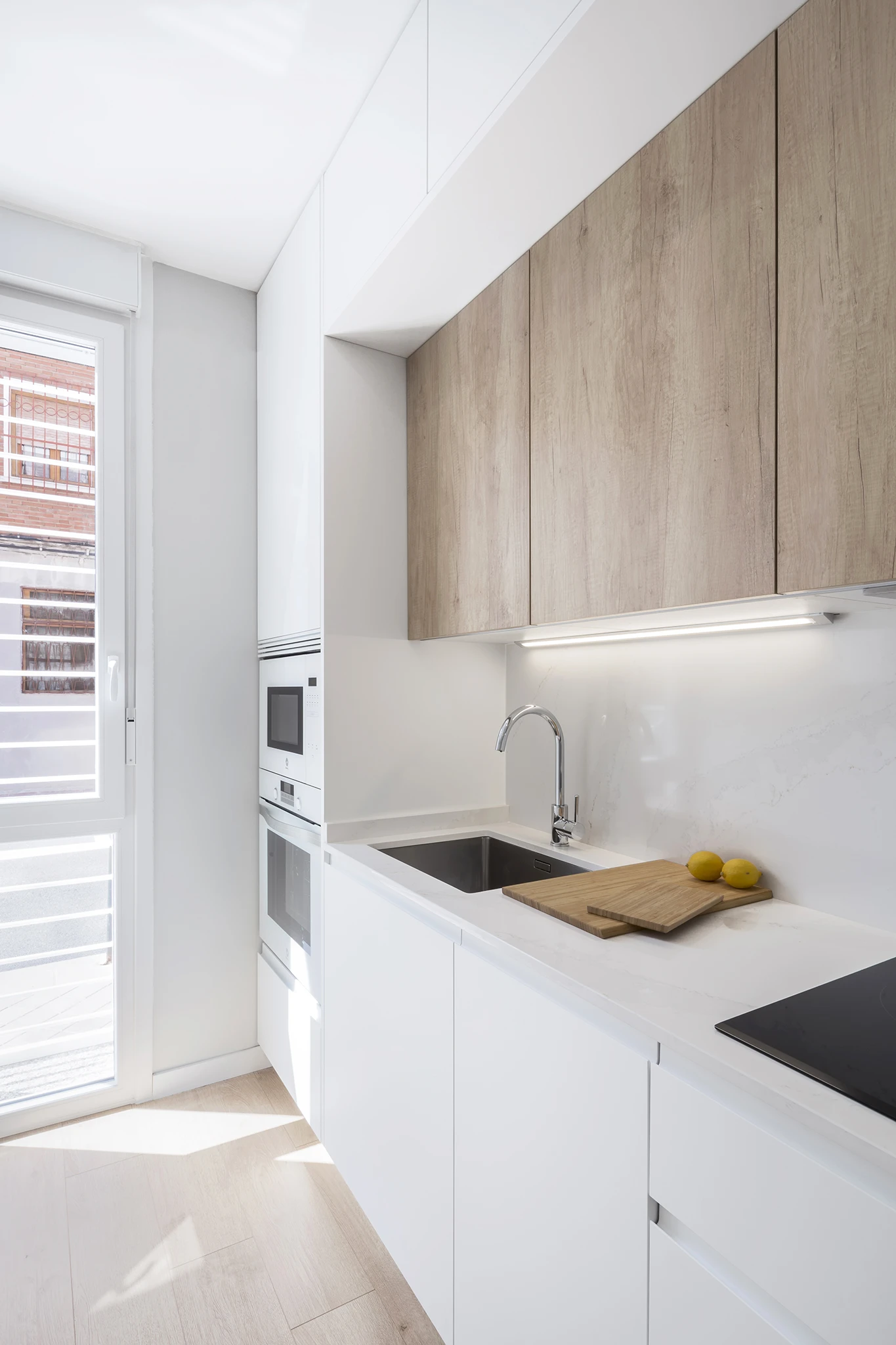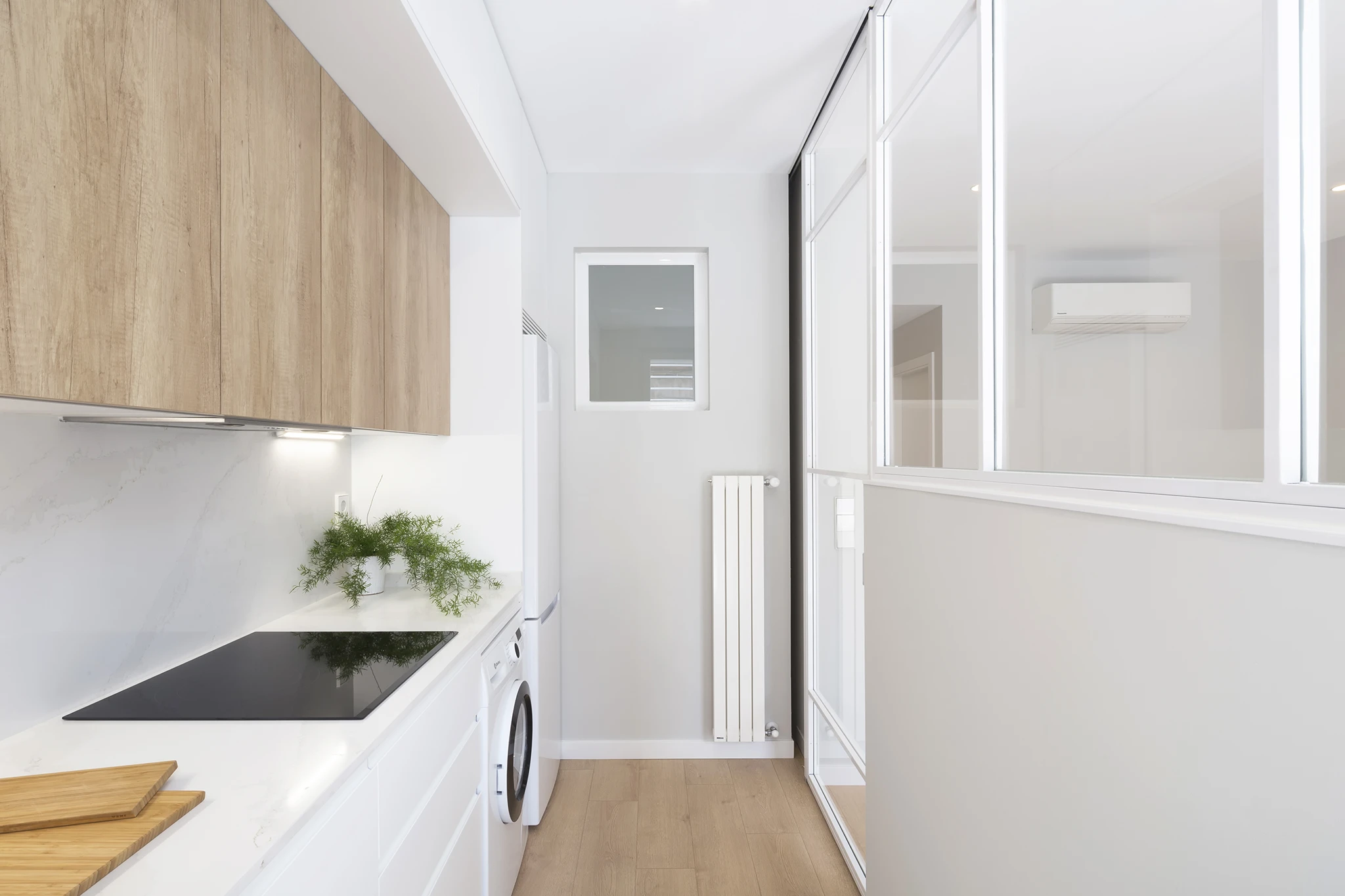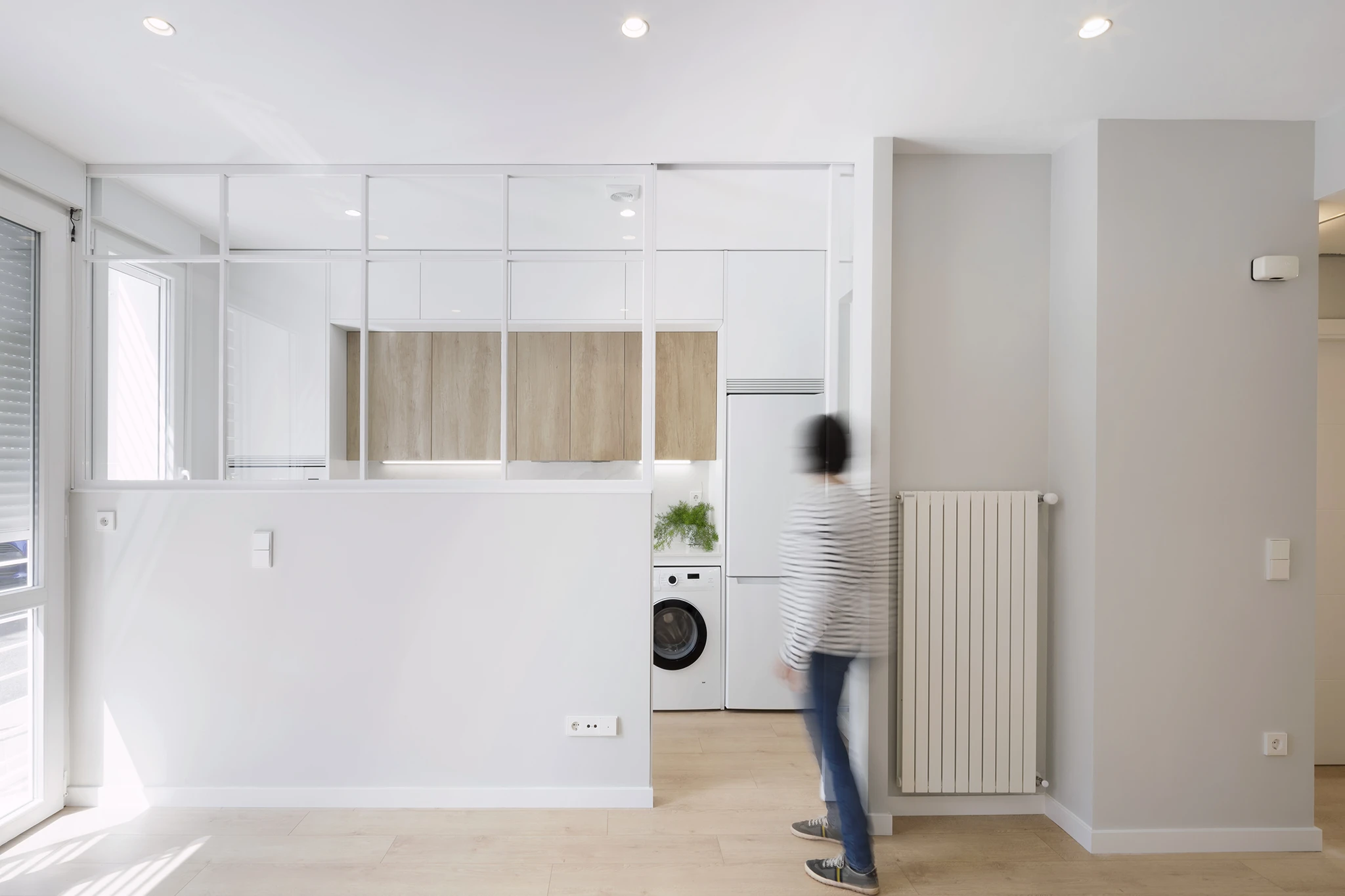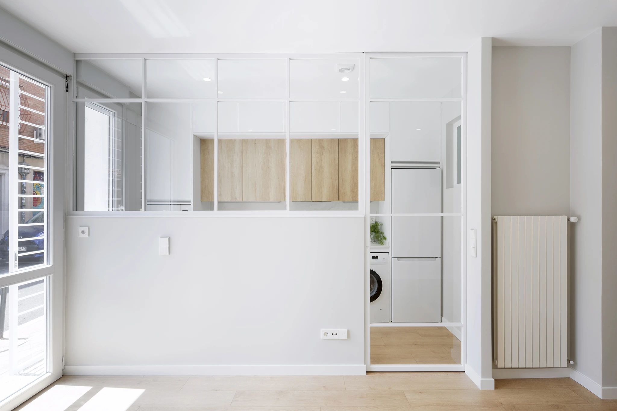 Esta materialidad se traslada al interior para cumplir uno de los requisitos de la propiedad, que la cocina fuese independiente del salón. Debido al reducido espacio y para aumentar la sensación de amplitud visual, ambos espacios se separan mediante un tabique; ciego en su parte inferior para poder adosar en él algún mueble y permeable en su parte superior para permitir el paso de luz y la comunicación visual entre las dos zonas. La división superior se resuelve mediante una ligera carpintería metálica blanca acorde con el diseño de fachada.
