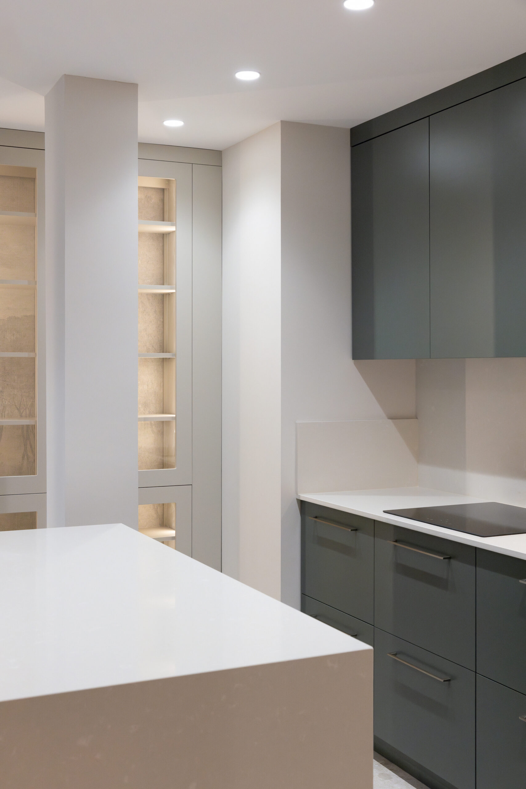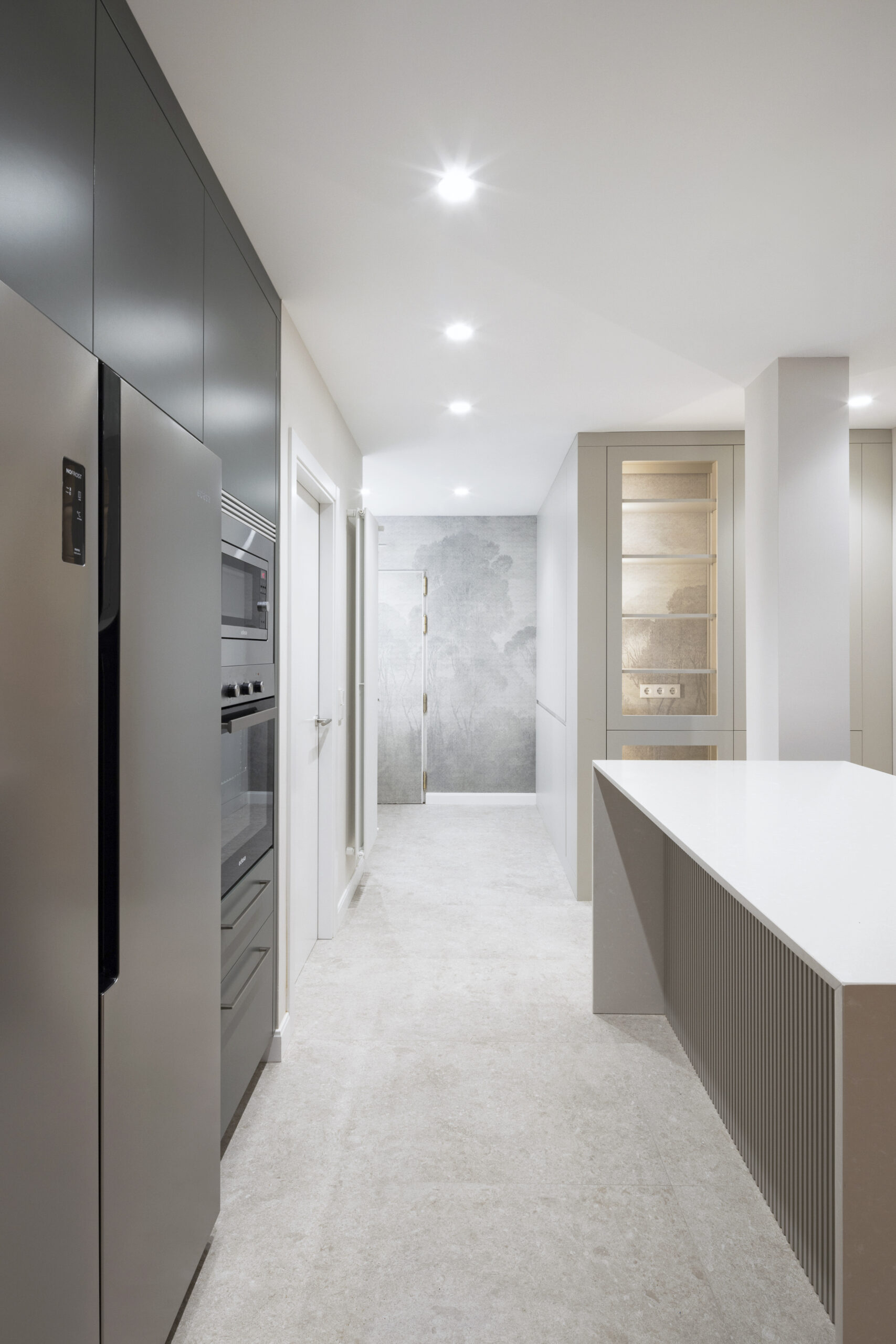 La cocina demanda una atención especial en el proyecto, ya que se trataba de un espacio con poca iluminación natural condicionado por la presencia de un pilar central. Para resolverla se introduce una amplia isla que da sentido a la anchura de la estancia incorporando la zona con taburetes para poder utilizarse a modo de mesa. La cocina se abre a la entrada de servicio que se integra, pasando desapercibida en la estancia, mediante un papel pintado en continuidad con el paramento.