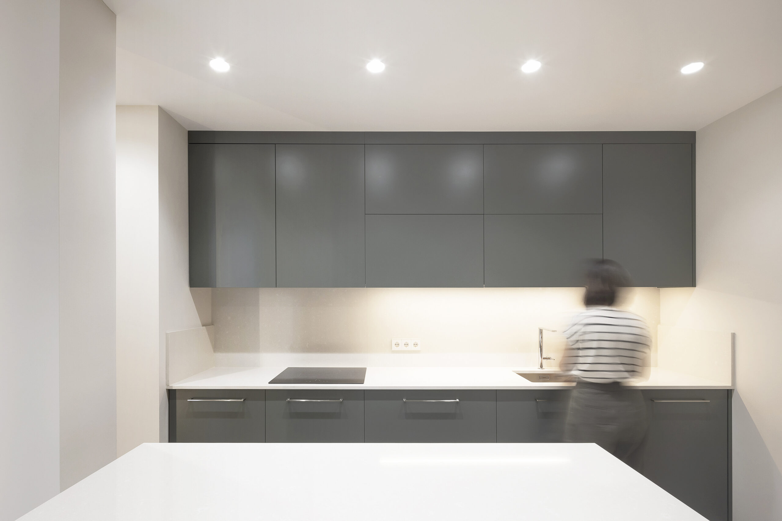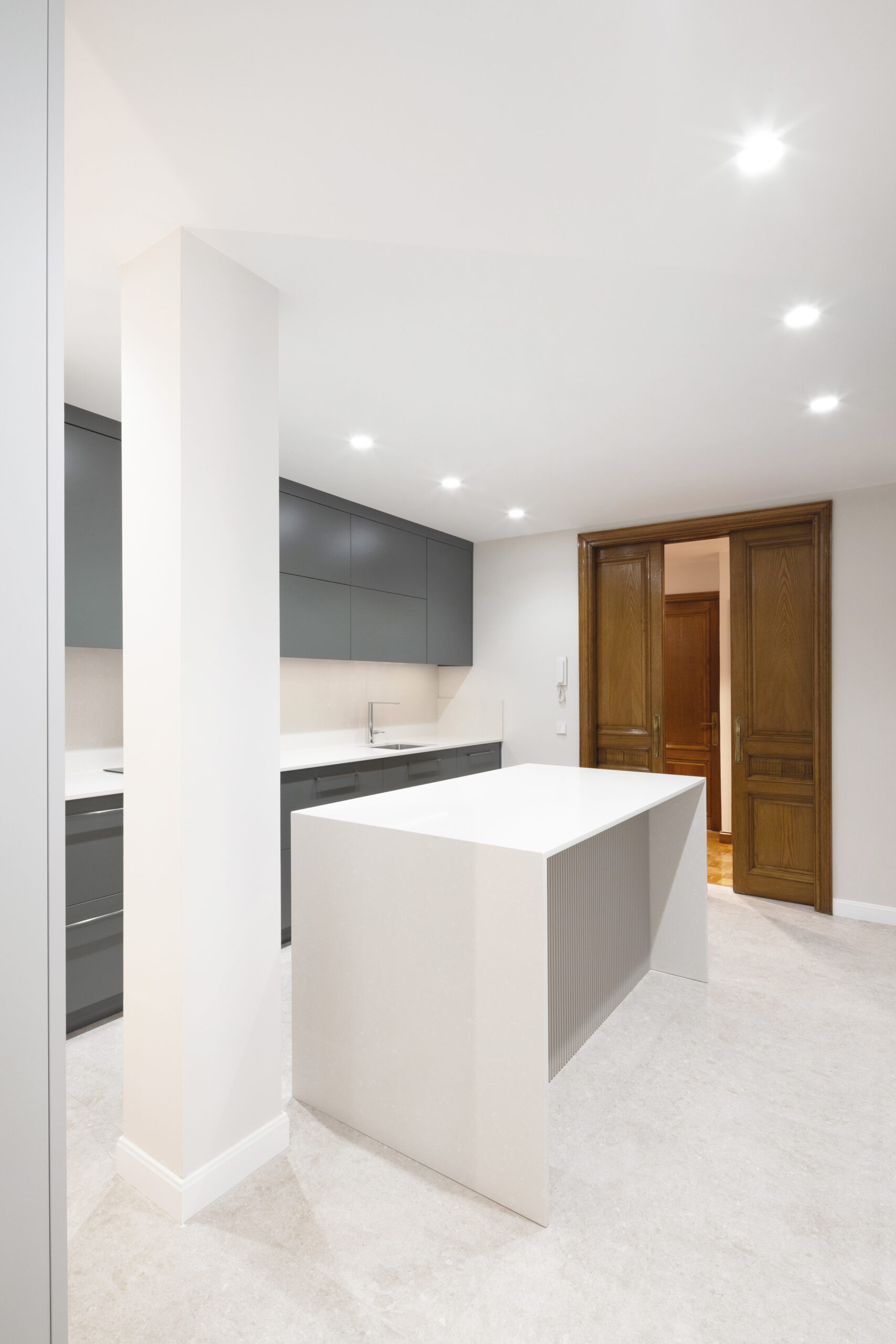 Para dar un mayor carácter a la unión entre cocina y espacios vivideros se reutilizan unas grandes puertas de madera de la propia vivienda, conectando lo contemporáneo con lo clásico y sus diferentes tonalidades, tanto en suelos como en paramentos.