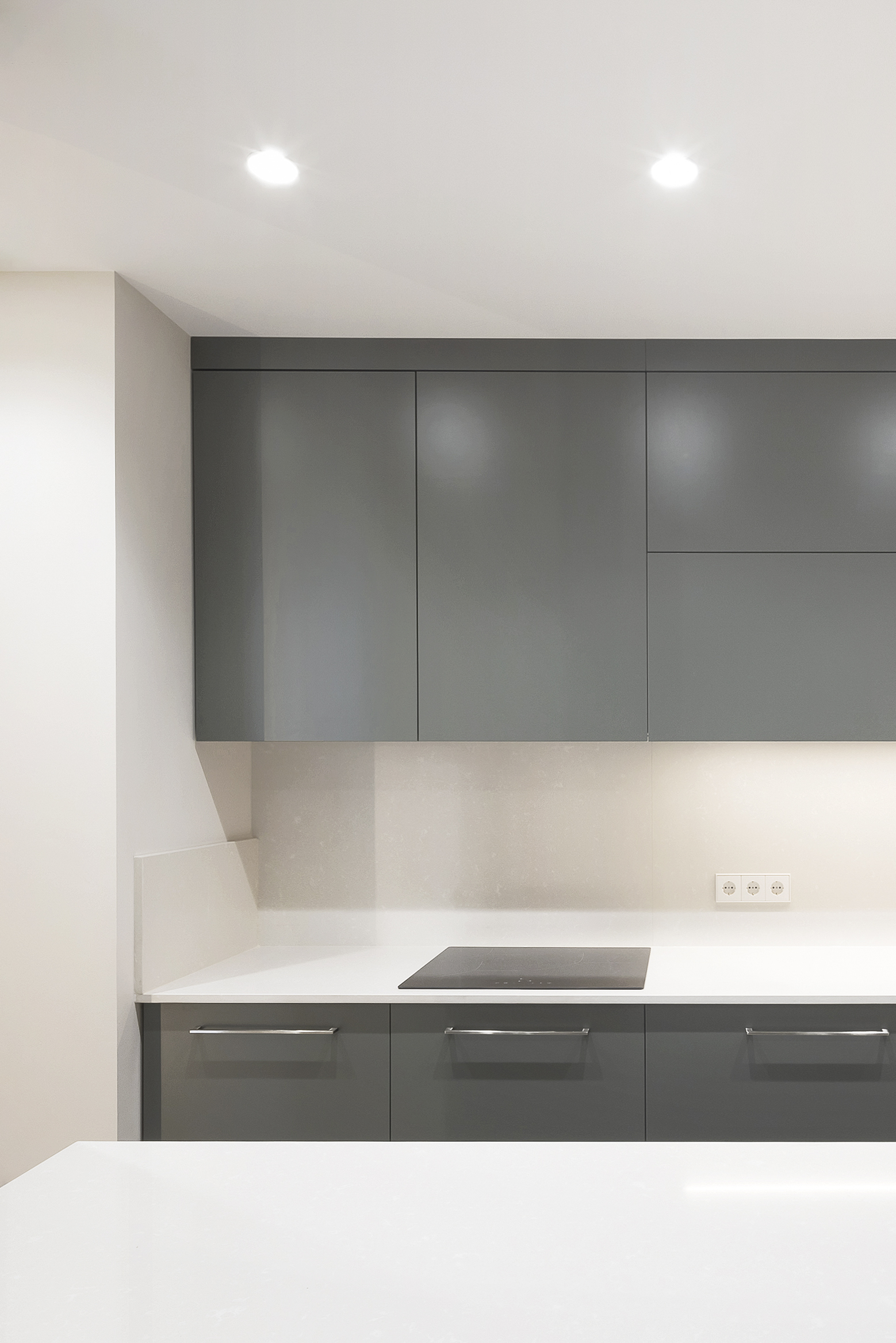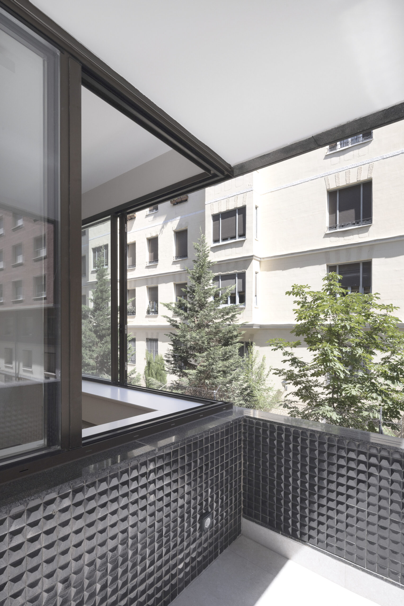 Se amplía ligeramente la terraza y se resuelve el encuentro entre ella y el salón con un gran ventanal en esquina, el cual aporta luminosidad al salón y permite abrir la vivienda al exterior, dando la sensación de que la estancia se convierte en terraza. La carpintería minimalista que además carece de perfil estructural en la propia esquina, lo que aumenta una vez abierta la sensación de amplitud y apertura entre ambas estancias.