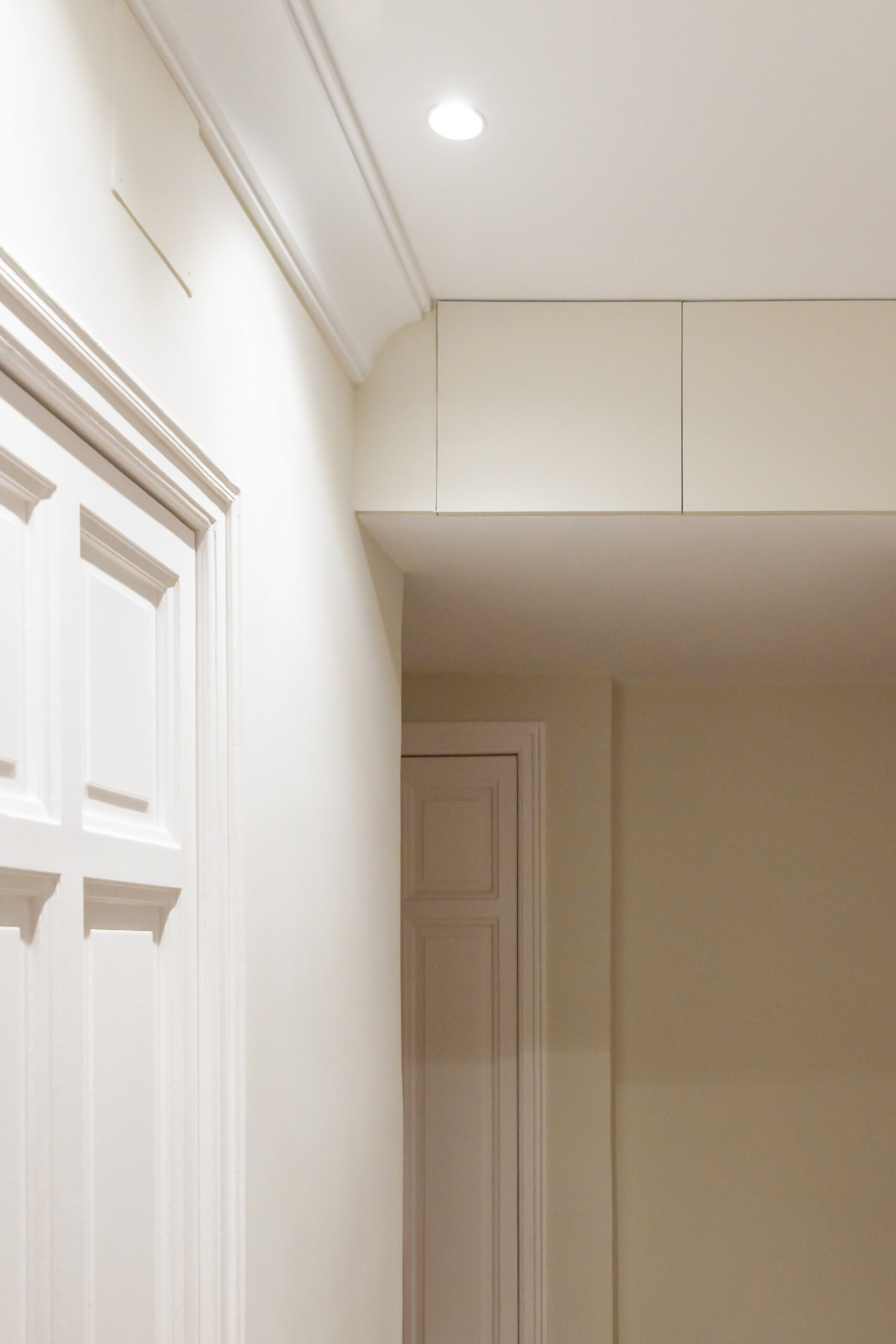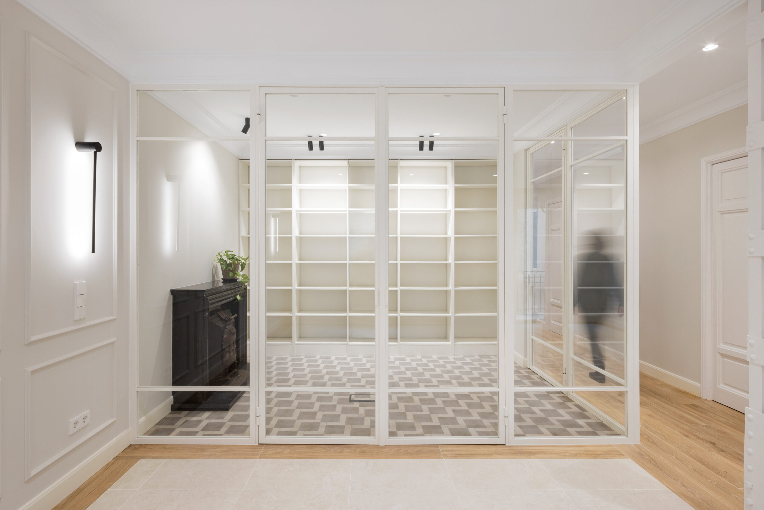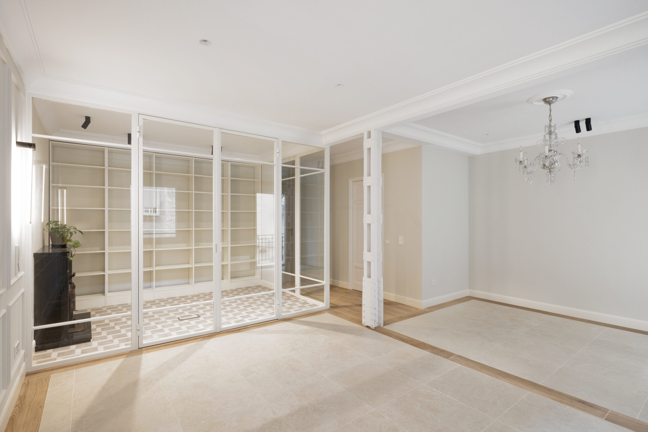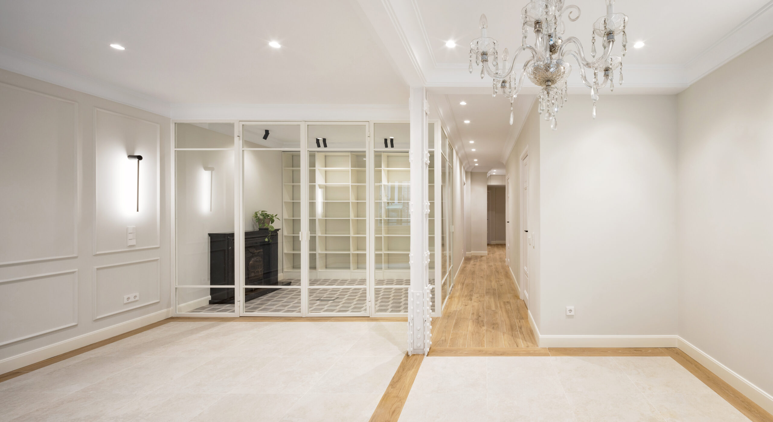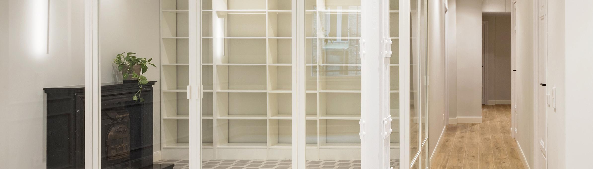 En el proyecto de reforma se abordaron tres aspectos muy importantes para los propietarios. En primer lugar, había que mejorar el aislamiento acústico de la vivienda en todas las zonas habitables, salón, comedor, estudio y dormitorios. El edificio data de principios de siglo XX, está realizado con estructura metálica roblonada, forjados de poca sección y muros de medianería de escaso espesor, todo ello hace que haya muy poca estanqueidad acústica entre las diferentes viviendas. Para conseguir esta mejora se realizó un trasdosado acústico en todo el perímetro, se aisló por completo el falso techo y se renovó el plastón del suelo.