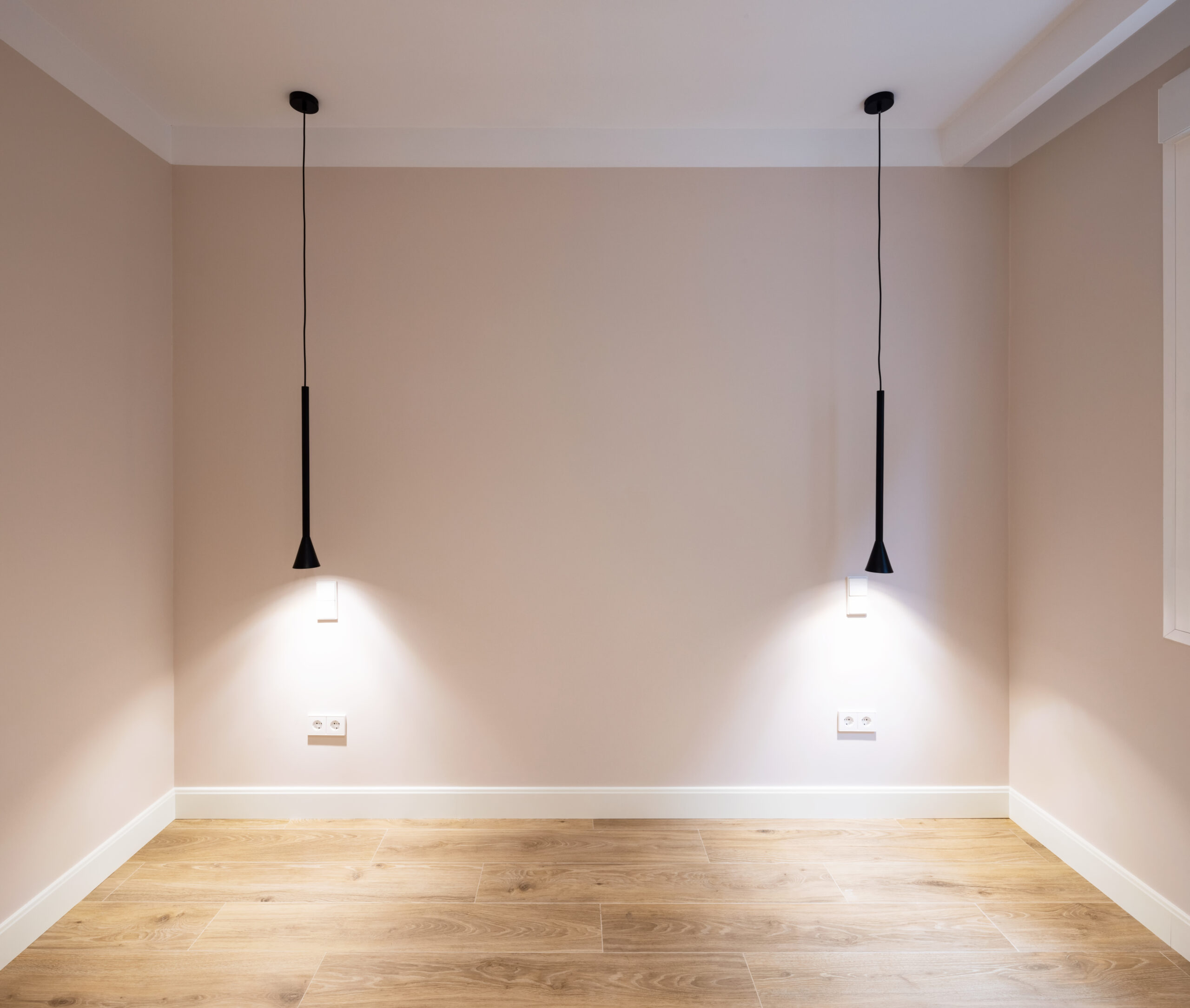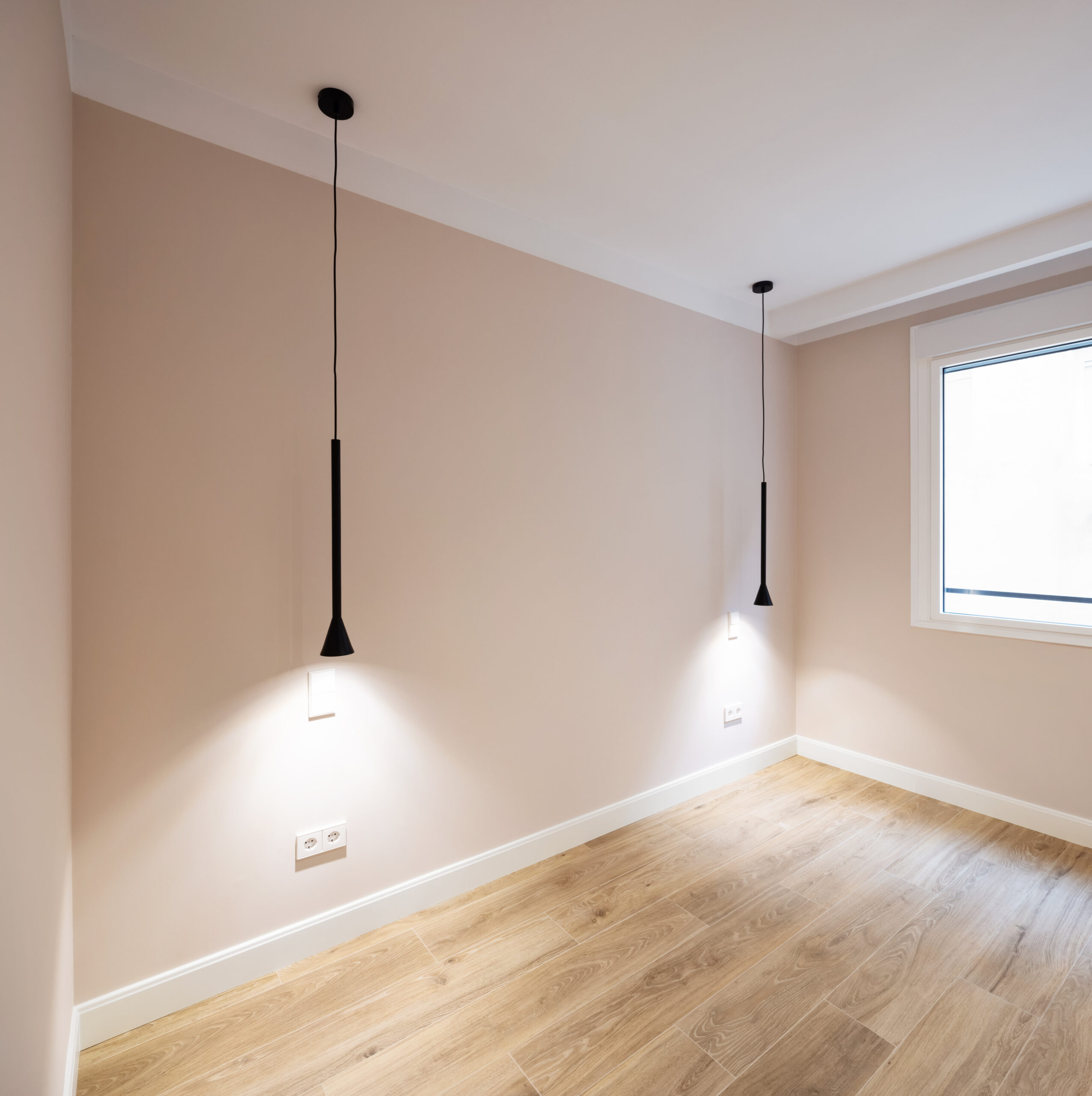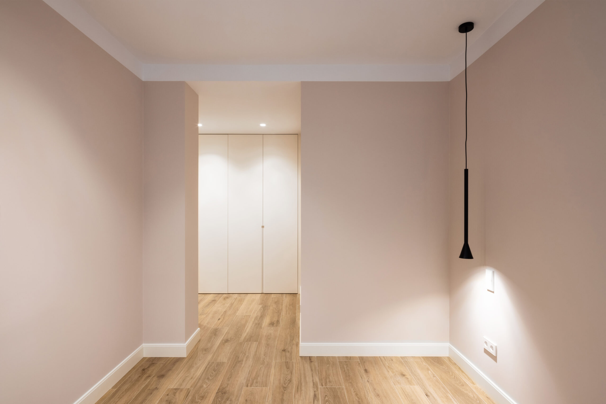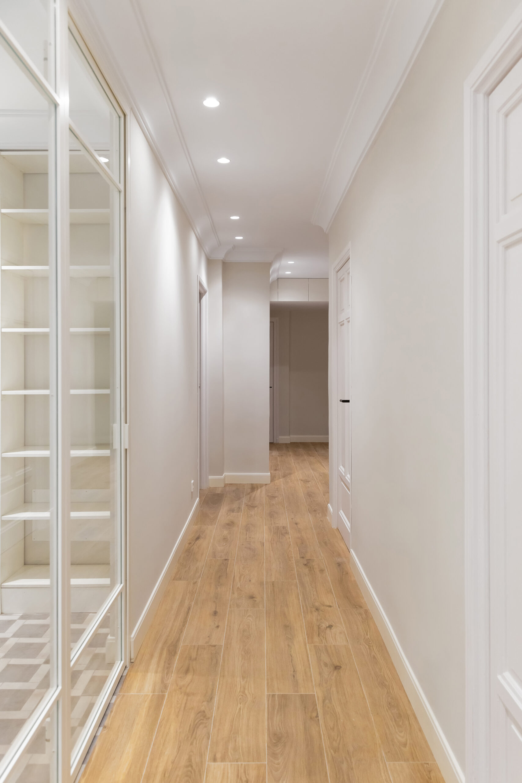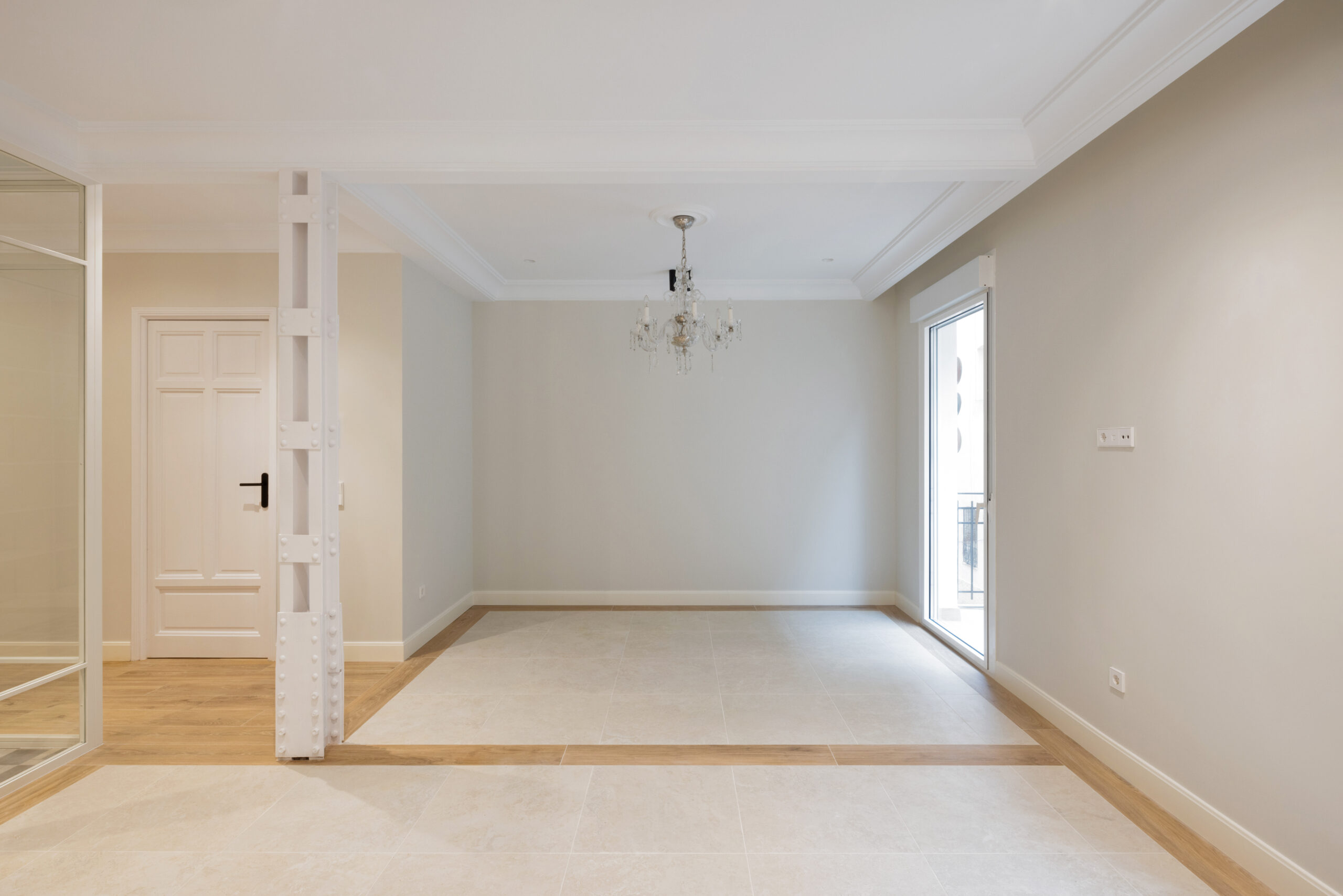 Por último, la vivienda es un primer piso interior, por lo que era muy importante que el proyecto aportara luminosidad a las diversas estancias. Para conseguirlo se optó por una paleta de colores en tonos neutros, utilizando un tono muy claro para el solado de la zona de salón – comedor y así conseguir un mayor reflejo de la luz natural que aporta el patio interior de la vivienda, todo eso en combinación con un buen planteamiento de la iluminación artificial, alternando iluminación general, de ambiente y puntual. Se escogió un pavimento porcelánico que imita a la madera de roble aportando calidez a la vivienda y enmarcando las zonas de salón comedor.
