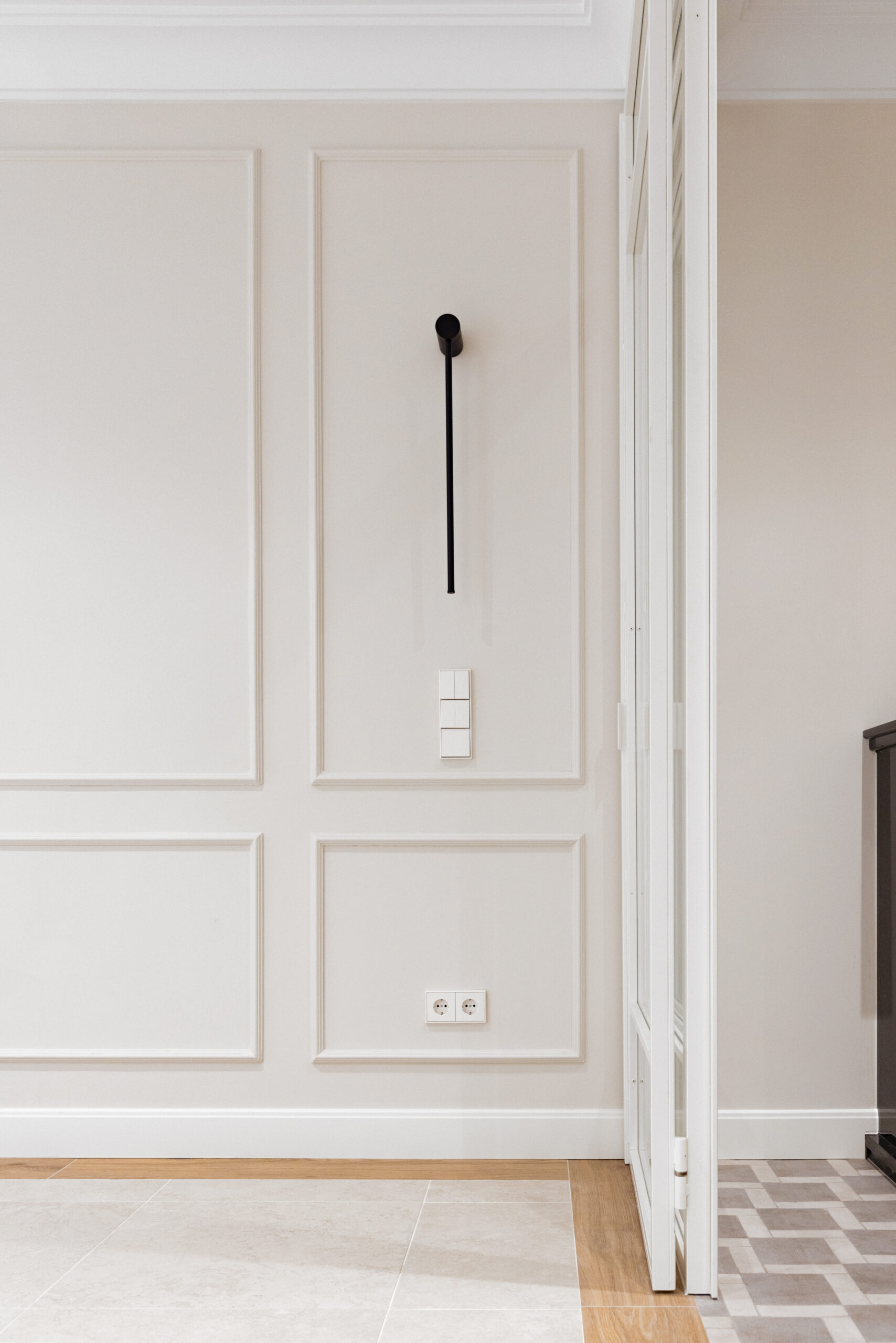 En la reforma se han incorporado elementos decorativos como cornisas y baquetones, lo que aporta un aspecto clásico y elegante a la vivienda, dichos elementos conviven con otros de un estilo mucho más contemporáneo como las luminarias en color negro, la cerrajería que envuelve toda la zona la zona de estudio y el pilar visto.